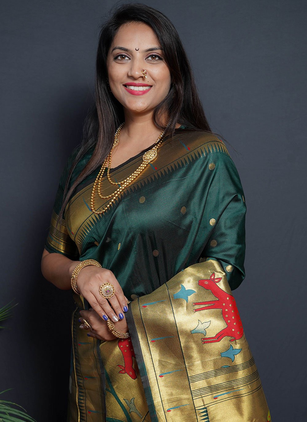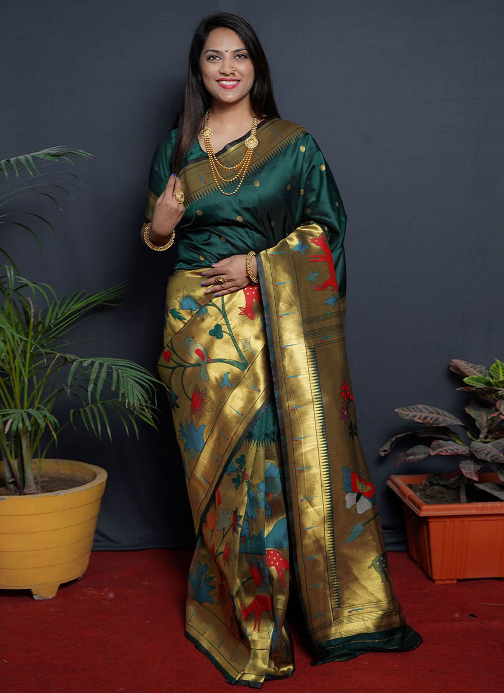 Be the sunshine of everybody’s eyes dressed in this lovely green silk classic saree. Beautified with jacquard work work all synchronized properly through the trend and style and design of the attire. Comes with matching blouse. (Slight variation in color, fabric & work is possible. Model images are only representative.)