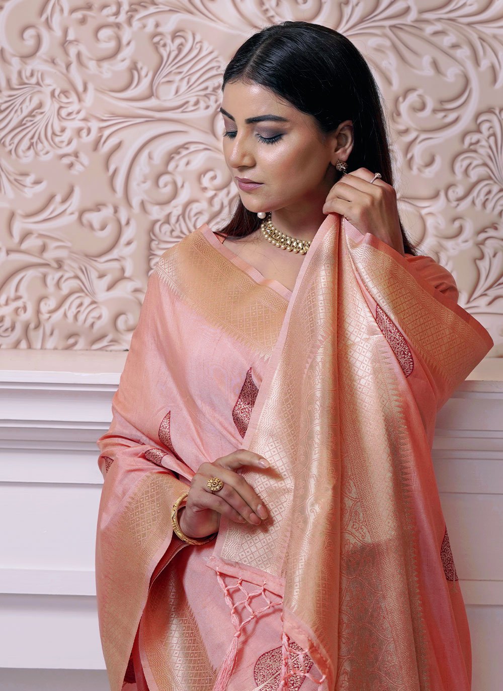 Give in to the exotic confluence of today & tomorrow in this beautiful attire. Be your own style diva with this pink silk saree. The weaving work on attire personifies the entire appearance. Comes with matching blouse. (Slight variation in color, fabric & work is possible. Model images are only representative.)