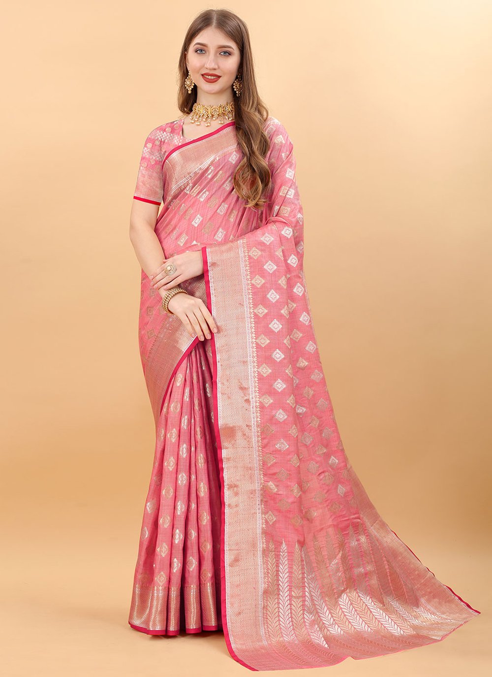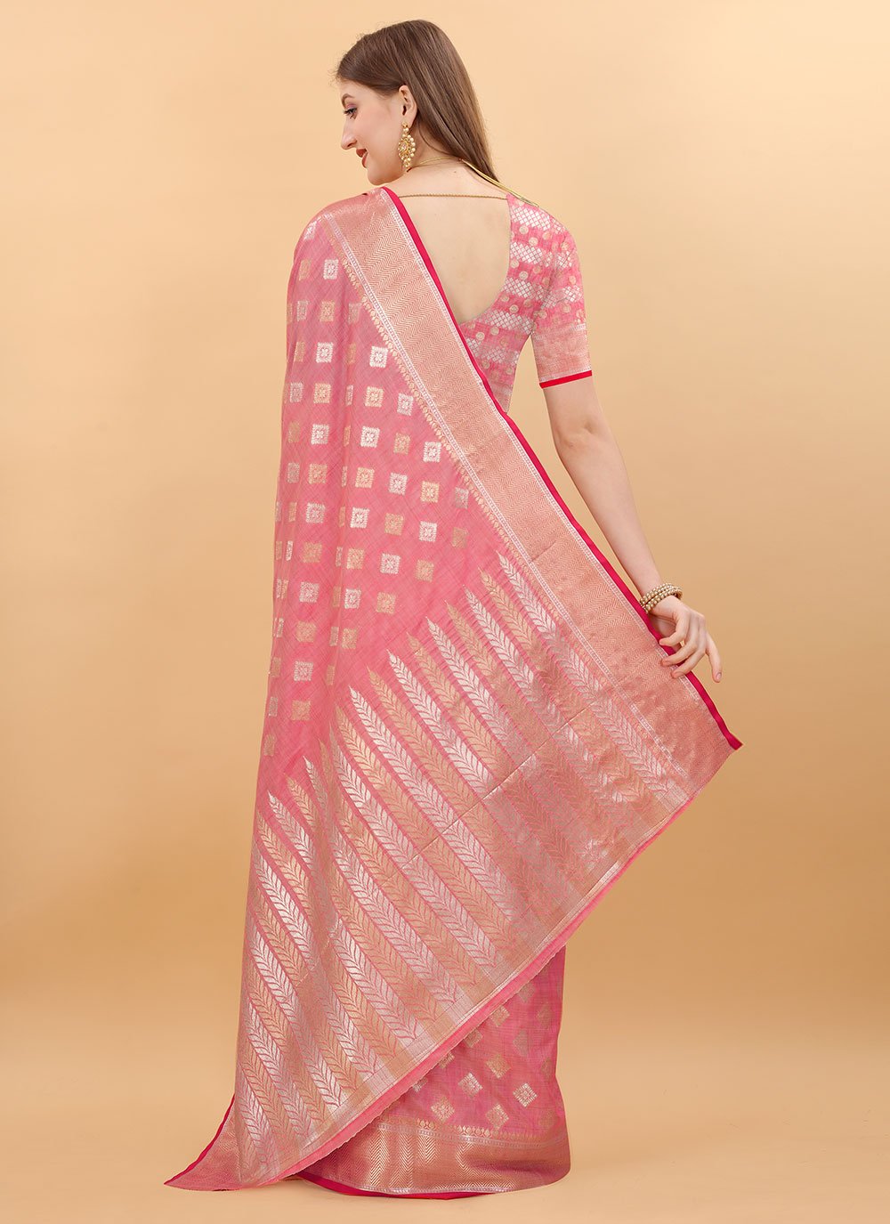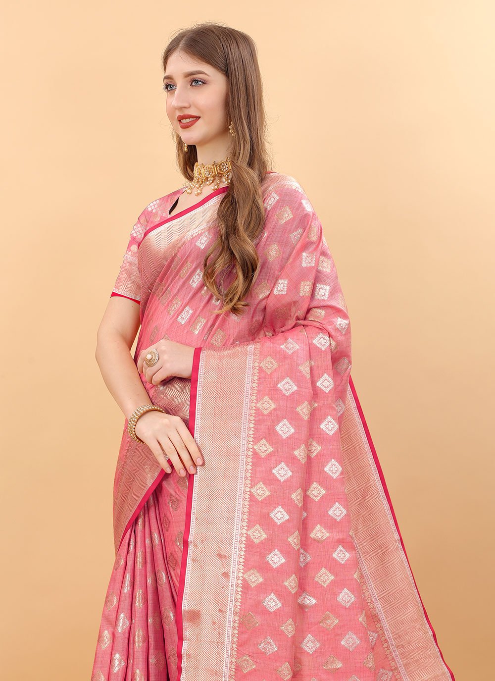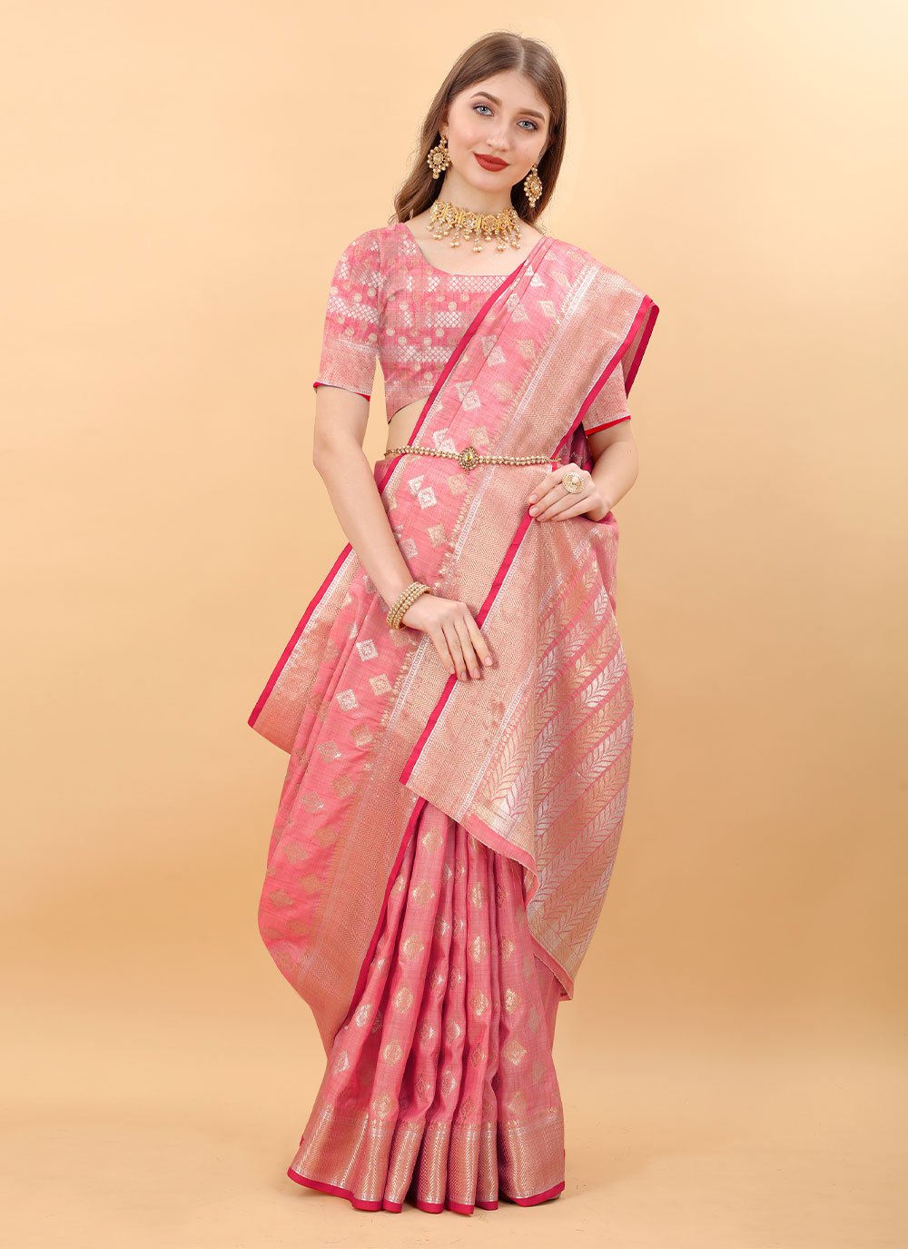 Grab the second look in this elegant attire for this season. This pink silk classic saree is accenting the gorgeous feeling. The weaving work on attire personifies the entire appearance. Comes with matching blouse. (Slight variation in color, fabric & work is possible. Model images are only representative.)