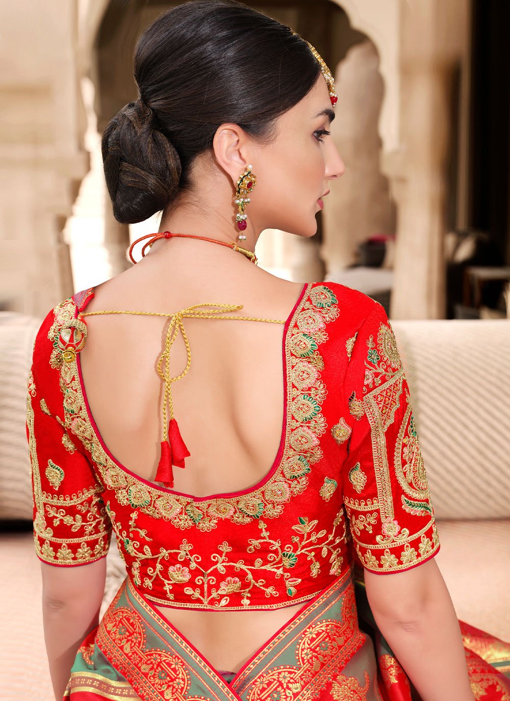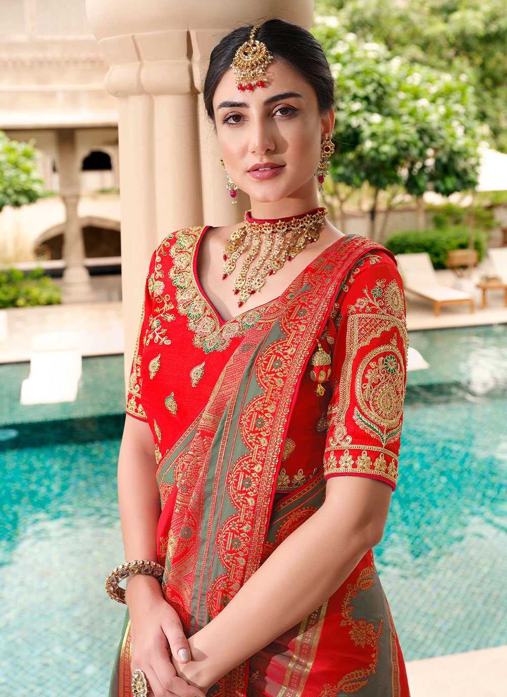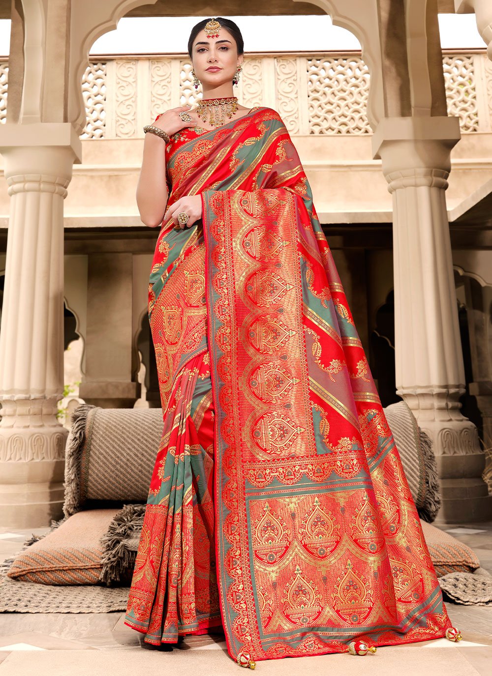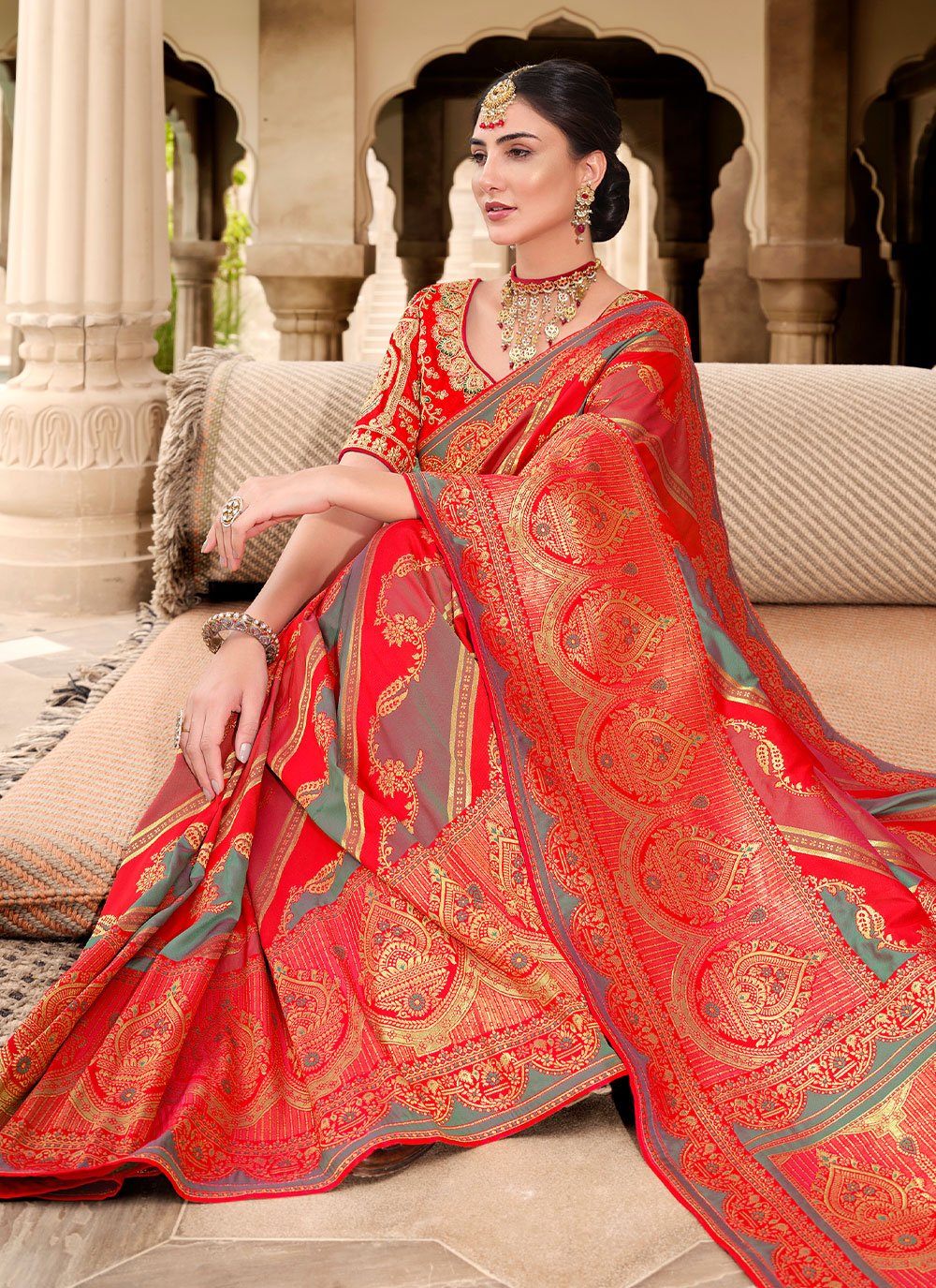 Be the sunshine of anyone’s eyes dressed with this appealing red silk classic saree. Beautified with weaving work all synchronized effectively with all the design and design of the attire. Comes with matching blouse. (Slight variation in color, fabric & work is possible. Model images are only representative.)