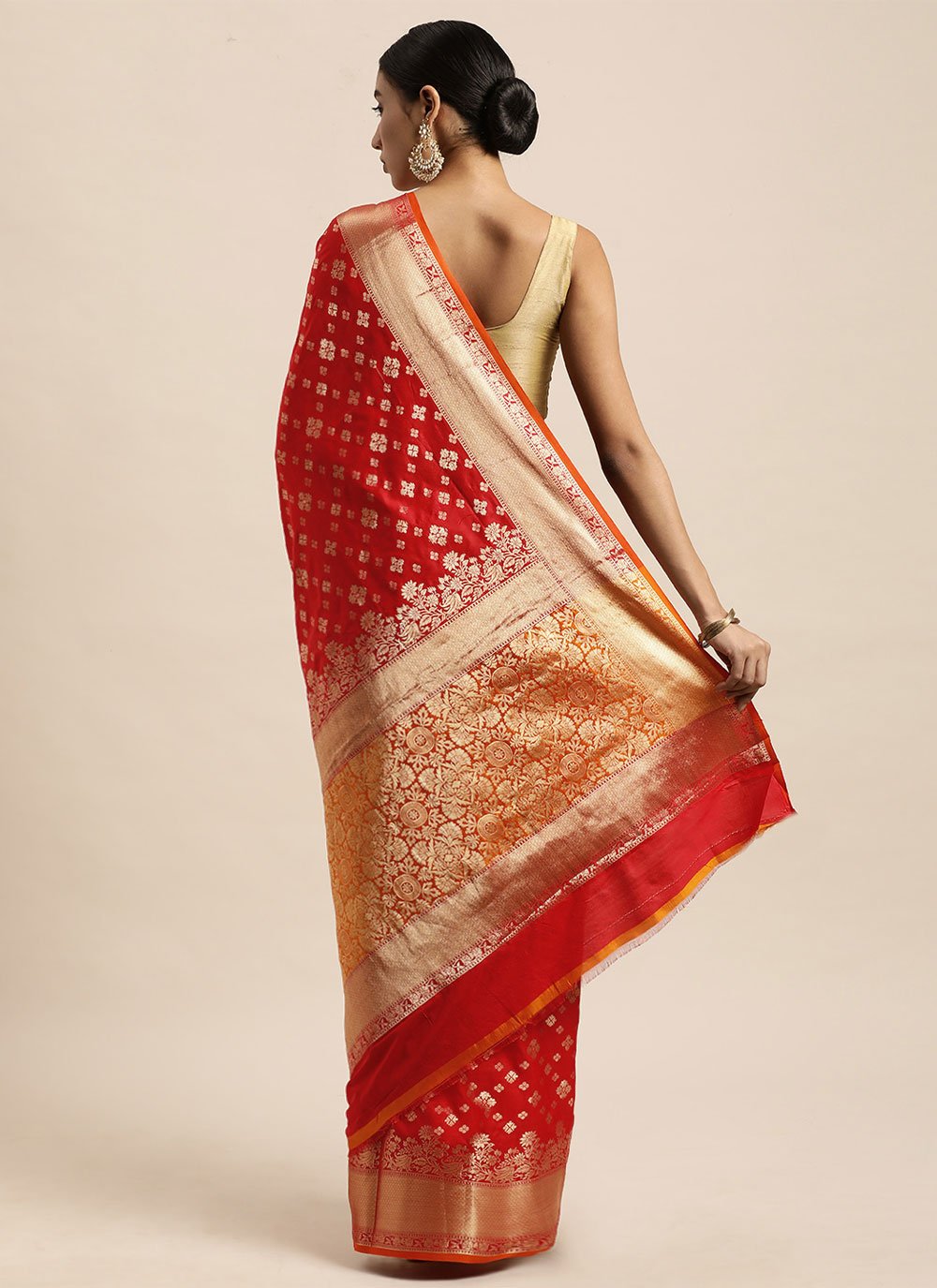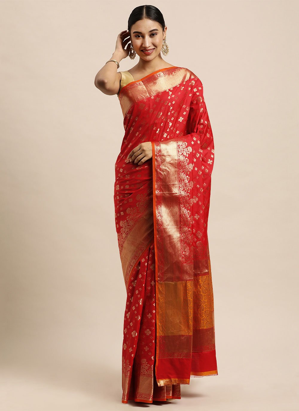 Everyone will admire you when you wear this clad to elegant affairs. Spread the aura of freshness with this red silk classic saree showing a touch of sensuality. The weaving work personifies the entire appearance. Comes with matching blouse. (Slight variation in color, fabric & work is possible. Model images are only representative.)
