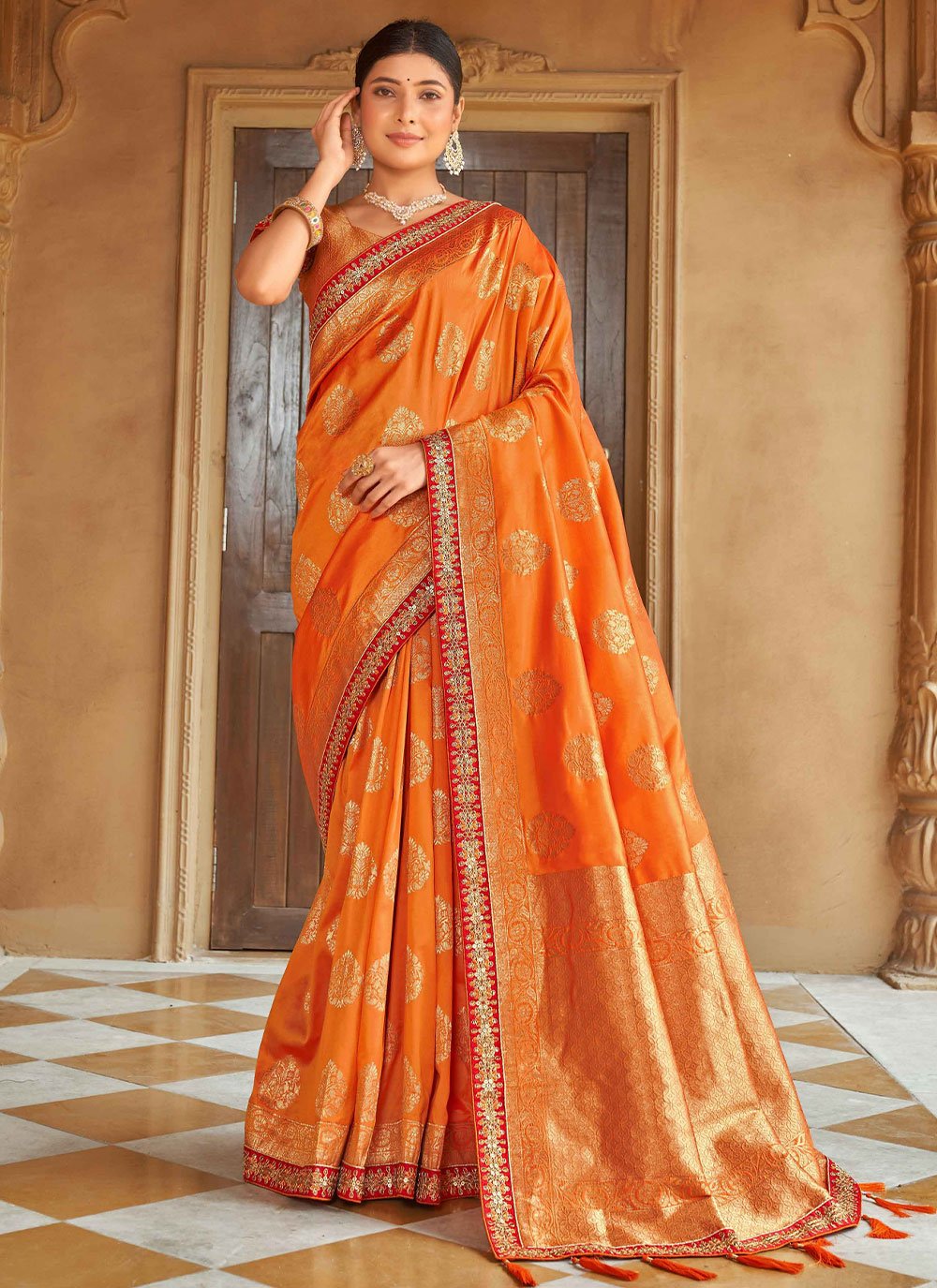 Enchant the mantra of being stylish in this attire. Women beauty is magnified tenfold in this alluring orange banarasi silk contemporary saree. This attire is nicely designed with weaving work. Comes with matching blouse. (Slight variation in color, fabric & work is possible. Model images are only representative.)