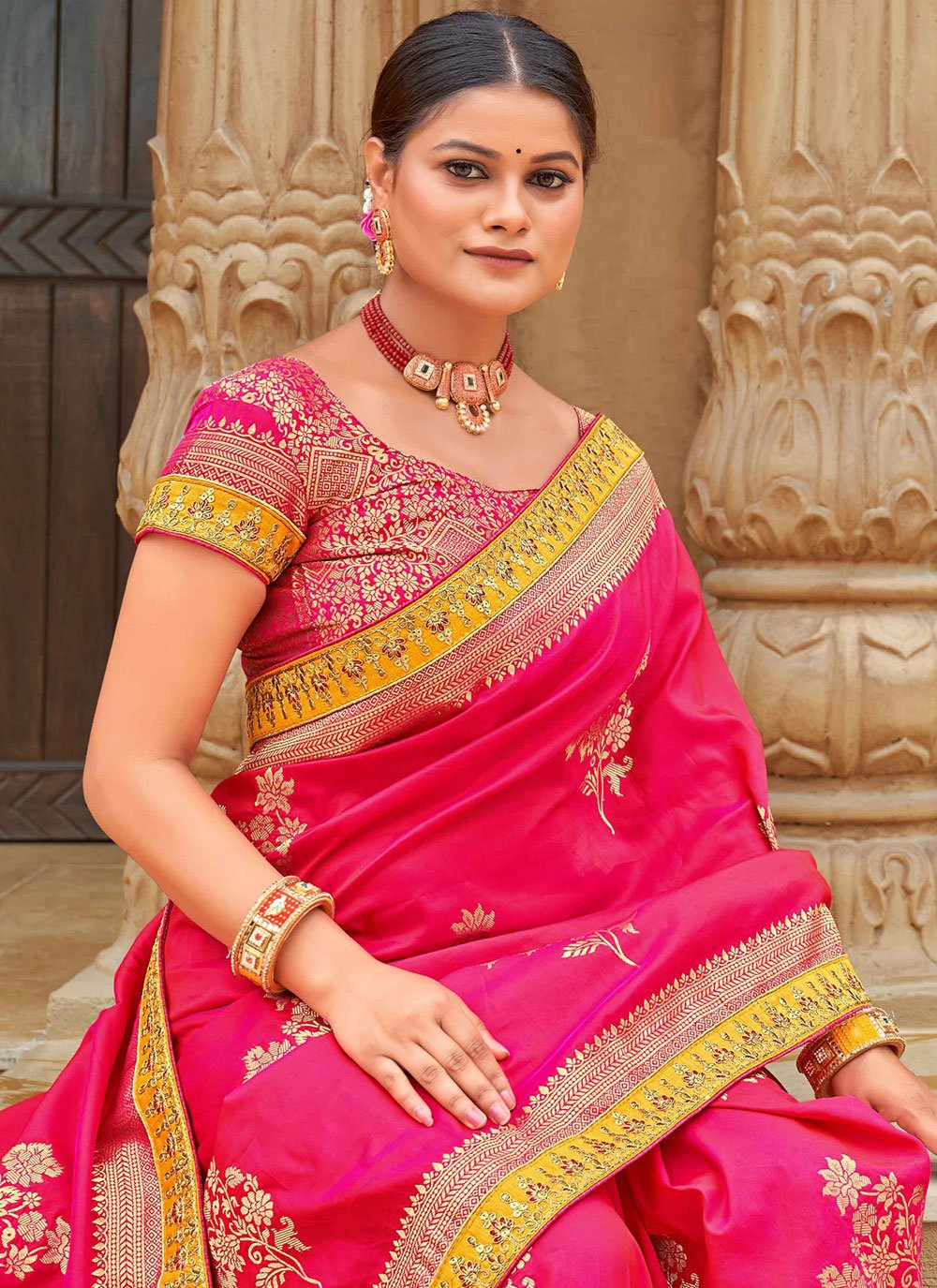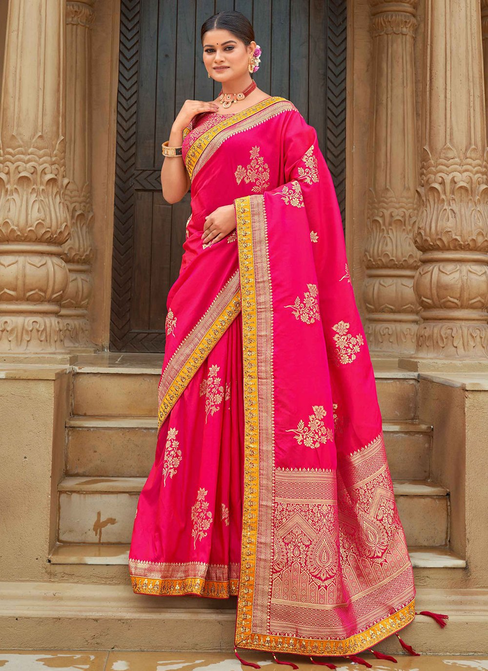 Be the sunshine of every person’s eyes dressed in this gorgeous pink banarasi silk contemporary saree. Beautified with weaving work all synchronized very well with all the trend and design of the dress. Comes with matching blouse. (Slight variation in color, fabric & work is possible. Model images are only representative.)