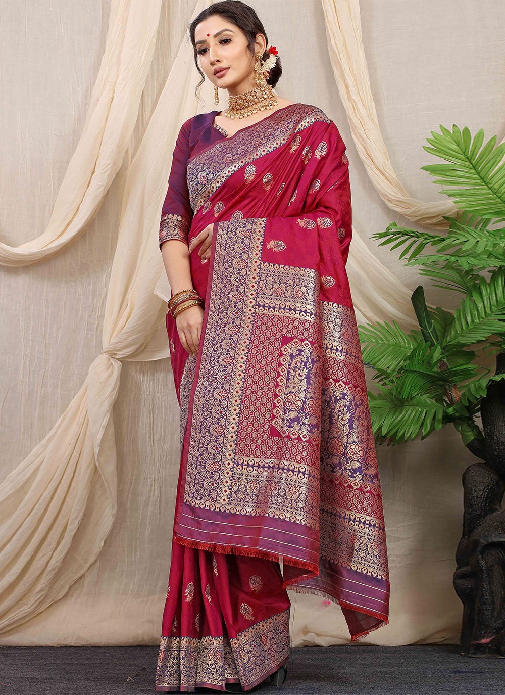 You will be confident to make a strong fashion statement with this red banarasi silk contemporary saree. Beautified with jacquard work work all synchronized nicely through the pattern and design of the attire. Comes with matching blouse. (Slight variation in color, fabric & work is possible. Model images are only representative.)
