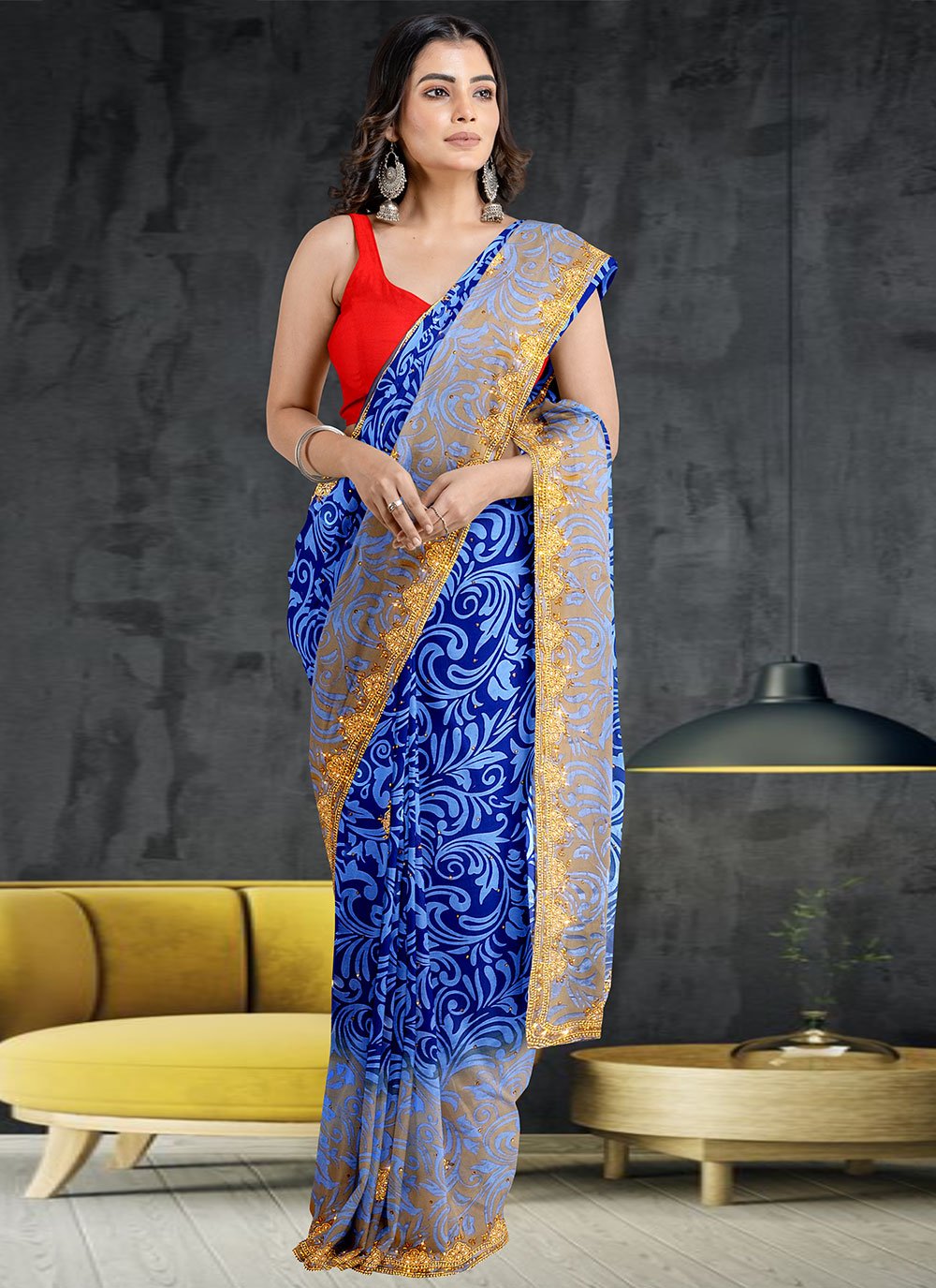 Contemporary Brasso Georgette Blue Hand Work Saree