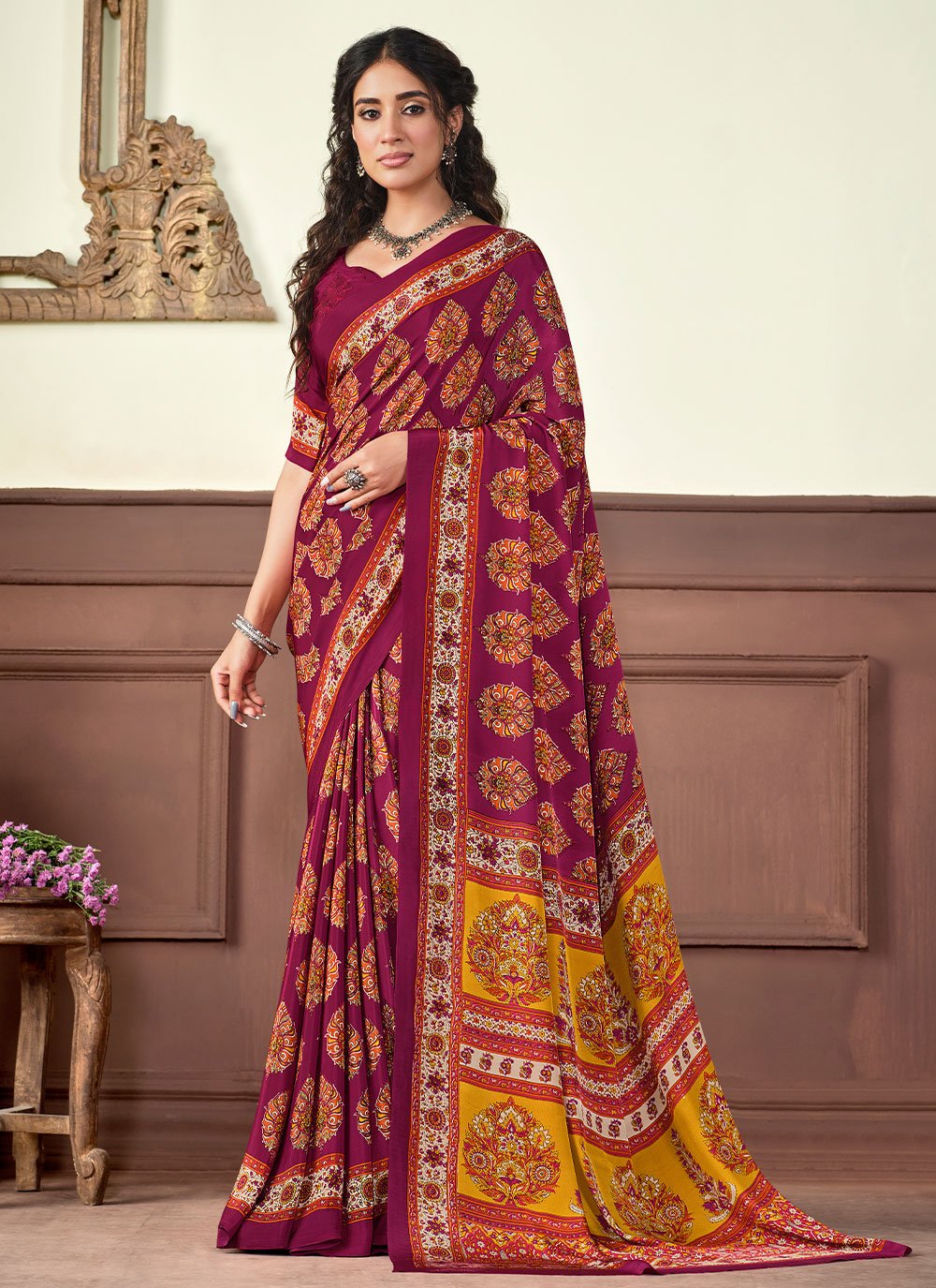 This maroon crepe silk contemporary style saree is accenting the interesting feeling. Beautified with printed work all synchronized effectively with the pattern and style and design of the dress. Comes with matching blouse. (Slight variation in color, fabric & work is possible. Model images are only representative.)