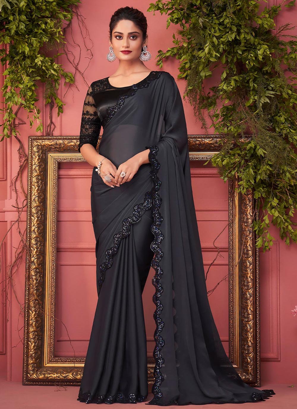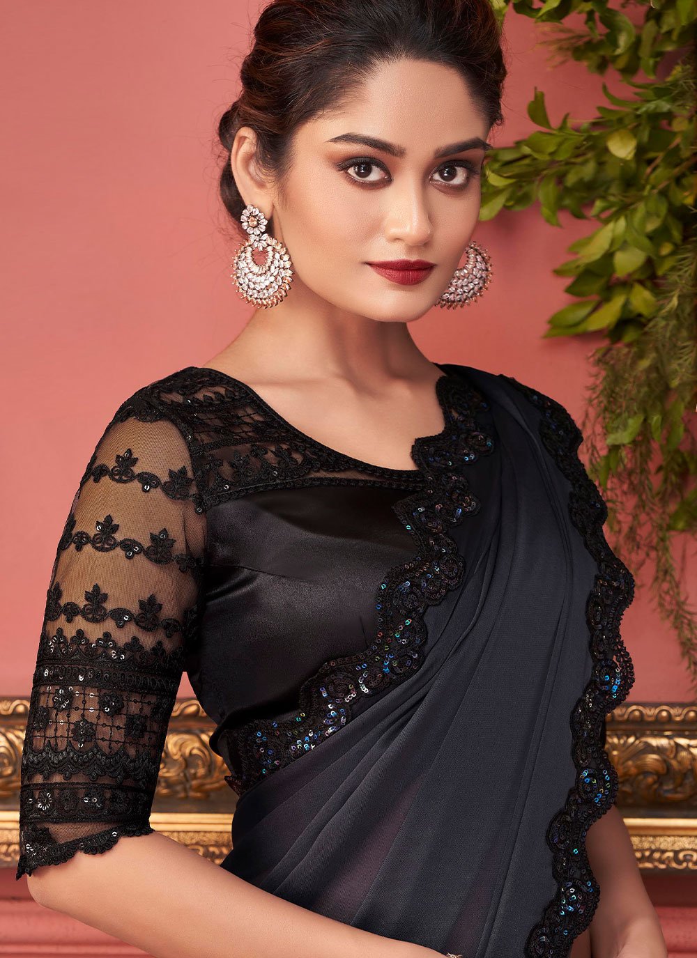Get going with this majestic and wonderful piece and make your dream attire look richer to your persona. We unfurl our the intricacy and exclusivity of our creations highlighted in this lovely black georgette contemporary saree. The lovely border and lace work throughout the attire is awe inspiring. Comes with matching blouse. (Slight variation in color, fabric & work is possible. Model images are only representative.)