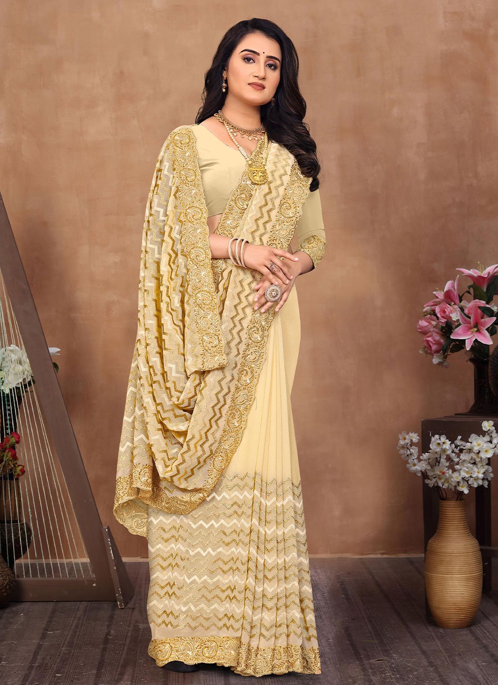 You will be the center of attention in this attire. Add grace and charm to your appearance in this beautiful cream georgette contemporary saree. The ethnic lace and zari work on the attire adds a sign of beauty statement to your look. Comes with matching blouse. (Slight variation in color, fabric & work is possible. Model images are only representative.)