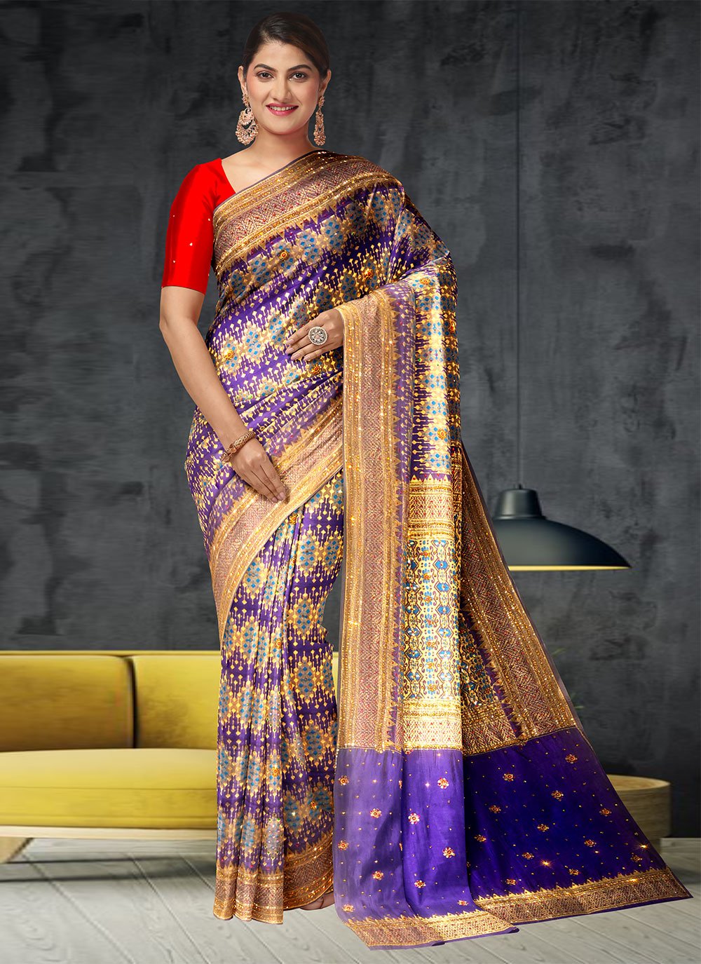 Fashion and style always depends on good color and fantastic combination of shades and so we create best shades to enhance your beauty and personality. Be your own style diva with this purple kanchipuram silk contemporary style saree. This attire is beautifully adorned with handwork work. Comes with matching blouse. (Slight variation in color, fabric & work is possible. Model images are only representative.)