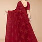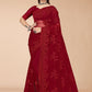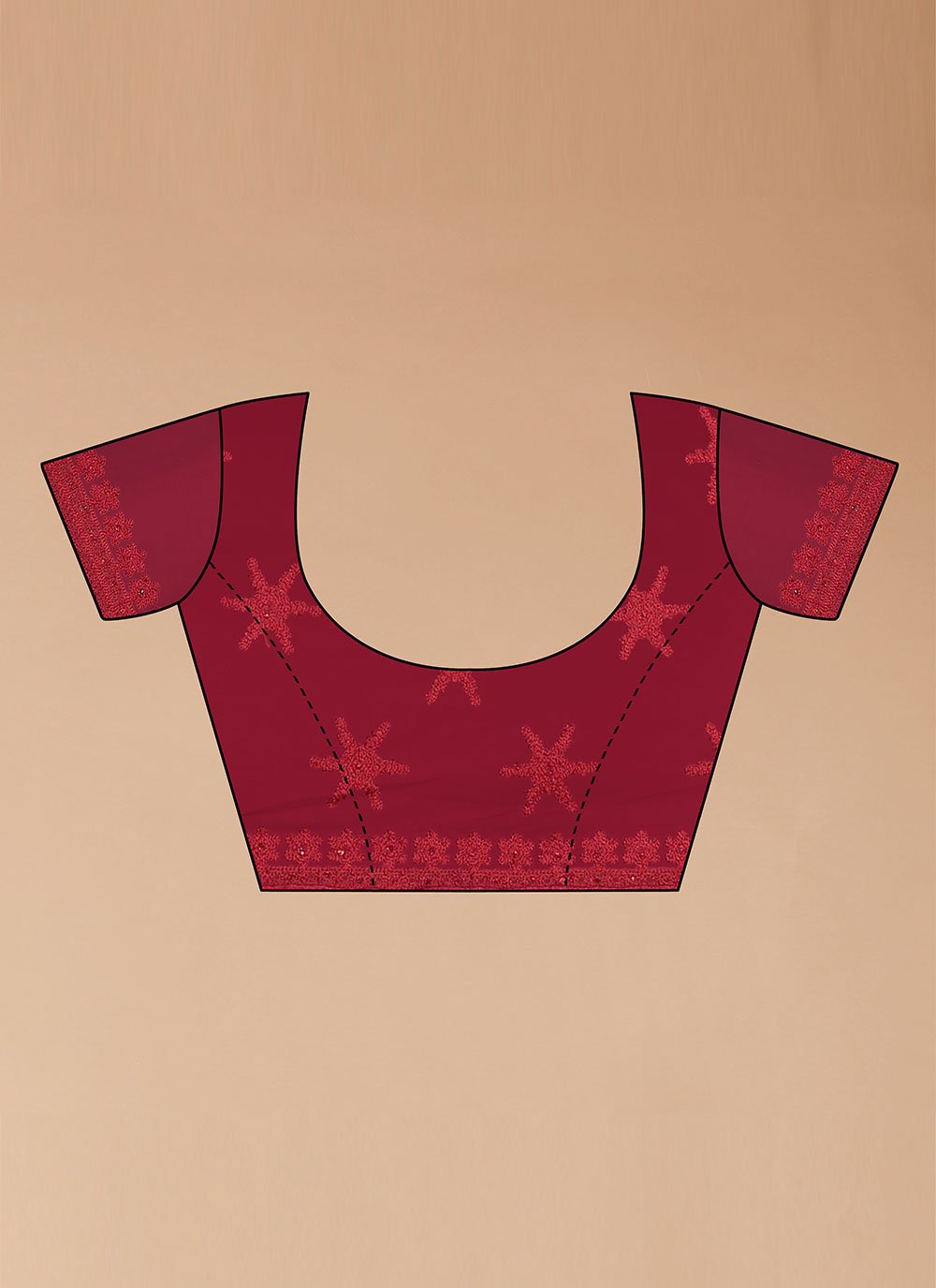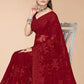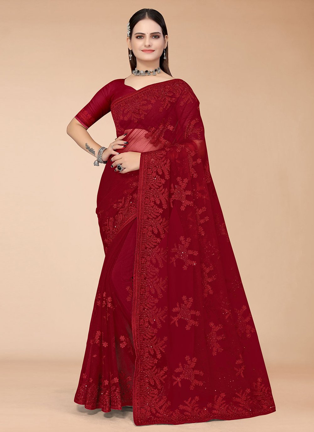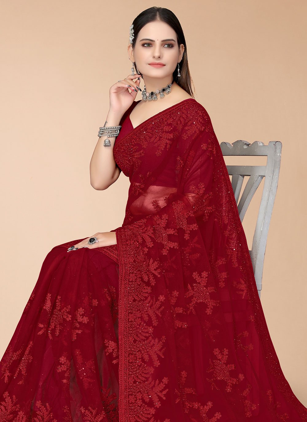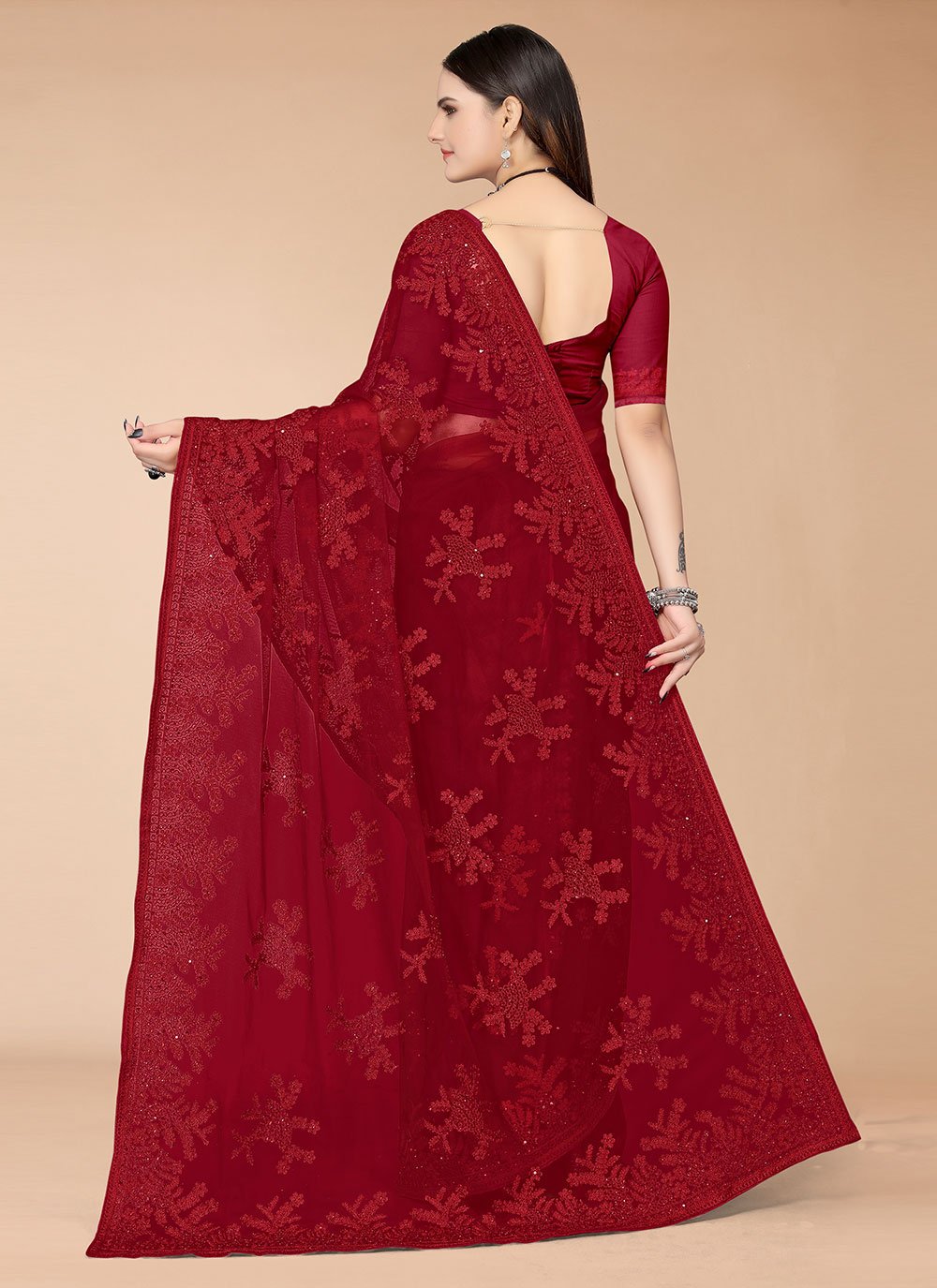 This pretty piece is a fairy tale that begins to unfold as you reveal your beauty in it. Make an adorable statement in this smashy maroon net contemporary saree. This attire is beautifully adorned with embroidered work. Comes with matching blouse. (Slight variation in color, fabric & work is possible. Model images are only representative.)