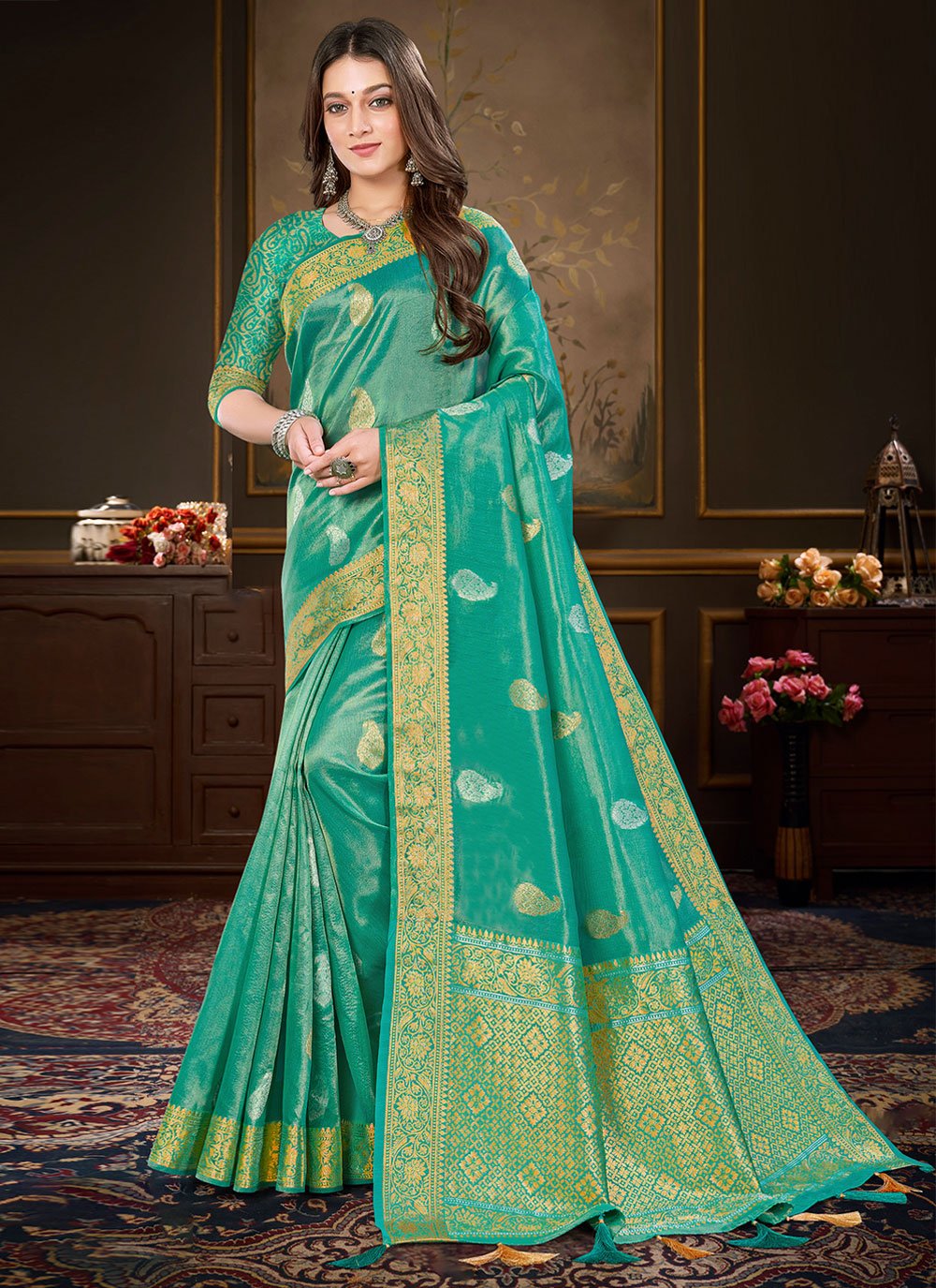 Fashion and pattern would be at the peak of your attractiveness after you dresses this green organza contemporary saree. The ethnic weaving work in the attire adds a sign of beauty statement for your look. Comes with matching blouse. (Slight variation in color, fabric & work is possible. Model images are only representative.)