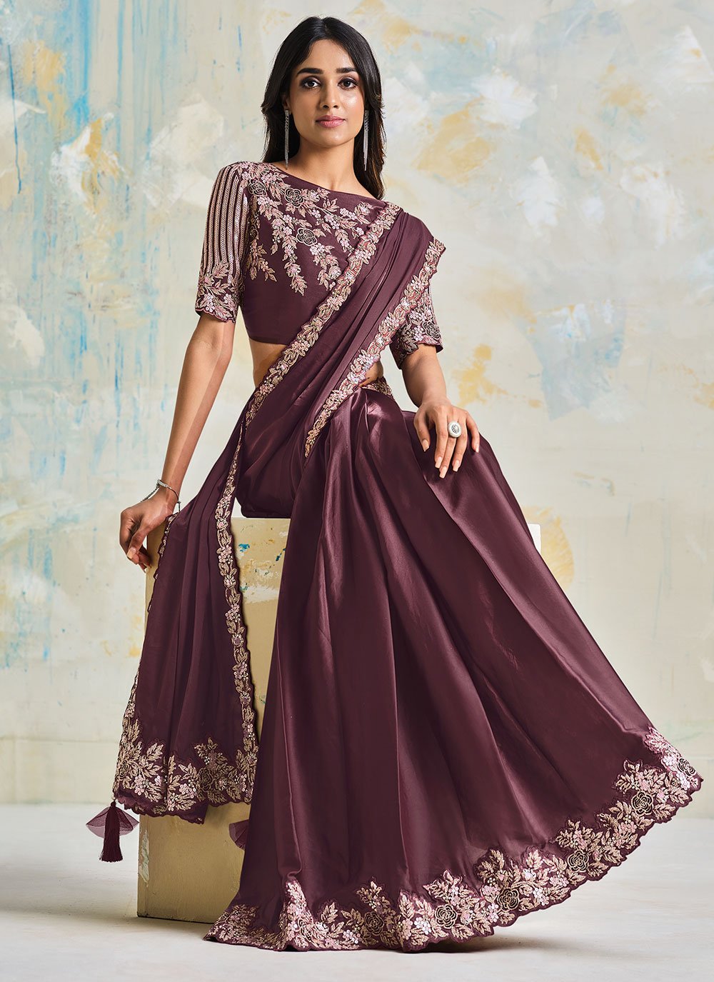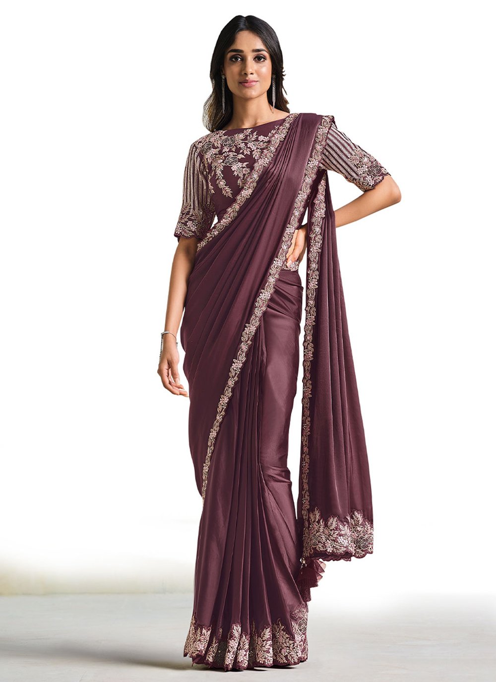 Get going with this majestic and wonderful piece and make your dream attire look richer to your persona. We unfurl our the intricacy and exclusivity of our creations highlighted in this lovely wine satin silk contemporary saree. The lovely embroidered work throughout the attire is awe inspiring. Comes with matching blouse. (Slight variation in color, fabric & work is possible. Model images are only representative.)