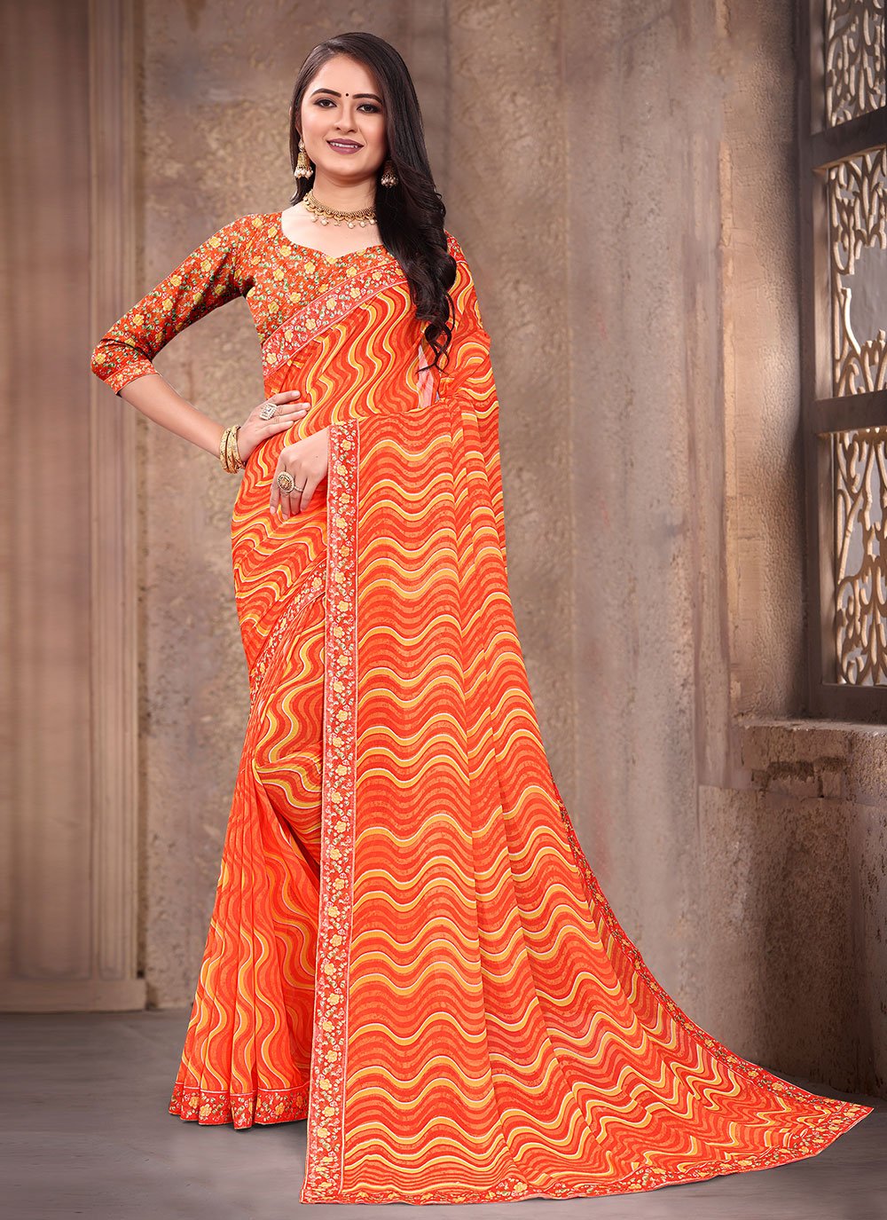 Orange weight less contemporary saree designed with border and digital print work. Comes with matching blouse.(Slight variation in color, fabric & work is possible. Model images are only representative.)