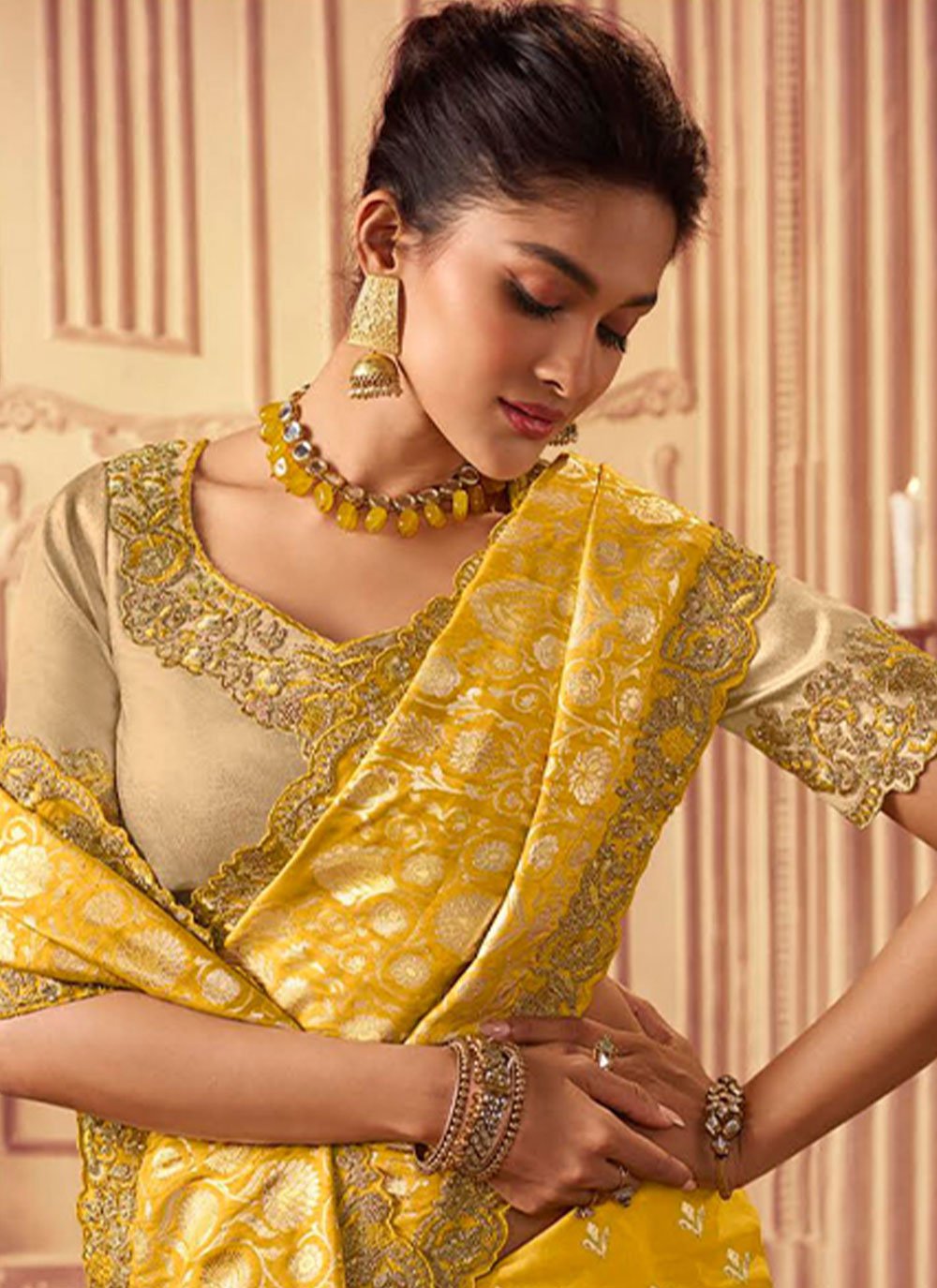 Elegance and honourable come together in this beautiful drape. Add grace and charm towards the look in this pretty yellow chinon and georgette designer saree. That you can see some fascinating patterns  performed with border, embroidered and resham work. Comes with matching blouse. (Slight variation in color, fabric & work is possible. Model images are only representative.)