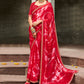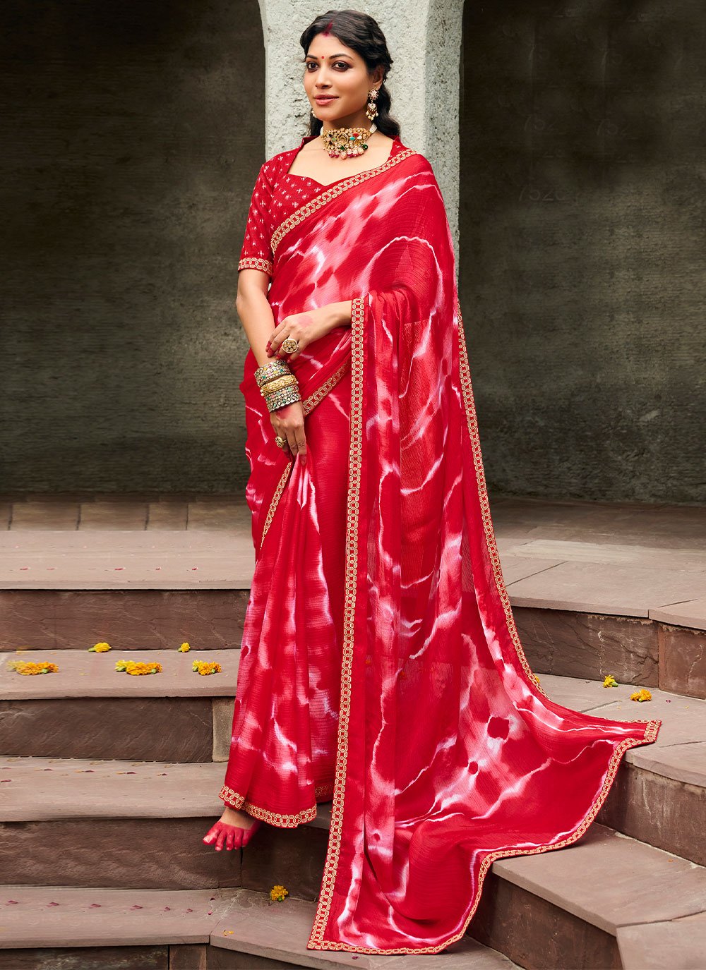 Fashion and style always depends on good color and fantastic combination of shades and so we create best shades to enhance your beauty and personality. Looking amazing with attachment of red faux chiffon designer saree. The printed work personifies the entire appearance. Comes with matching blouse. (Slight variation in color, fabric & work is possible. Model images are only representative.)
