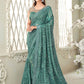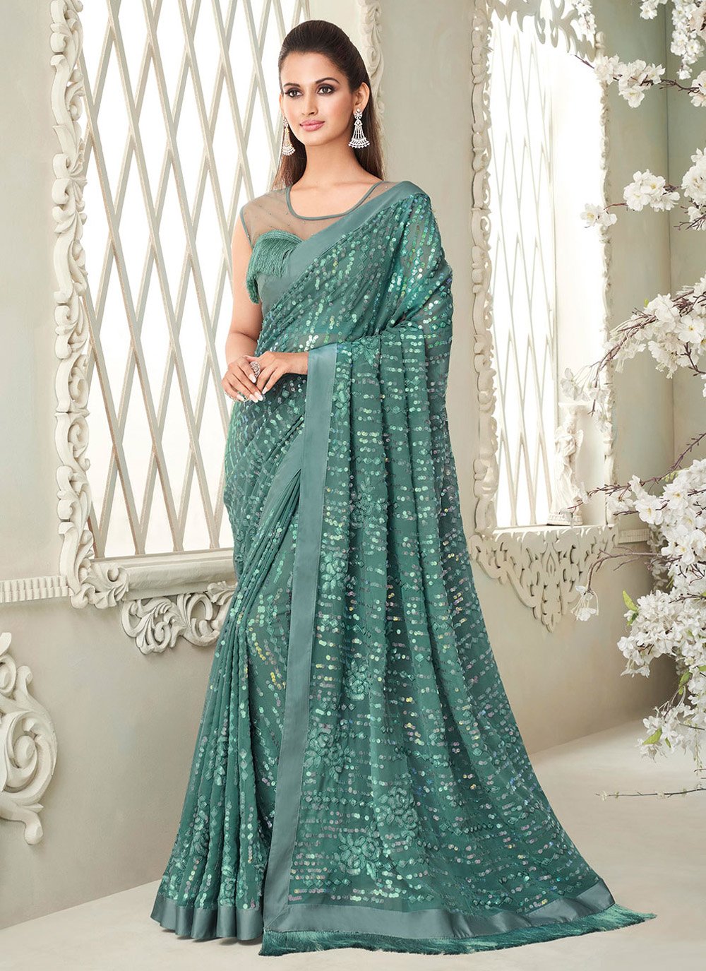 This brilliant array will make you the ultimate classic beauty at the next event you attend. Create a smoldering impact by this green georgette designer saree. This ravishing attire is amazingly embroidered with fancy work. Comes with matching blouse. (Slight variation in color, fabric & work is possible. Model images are only representative.)