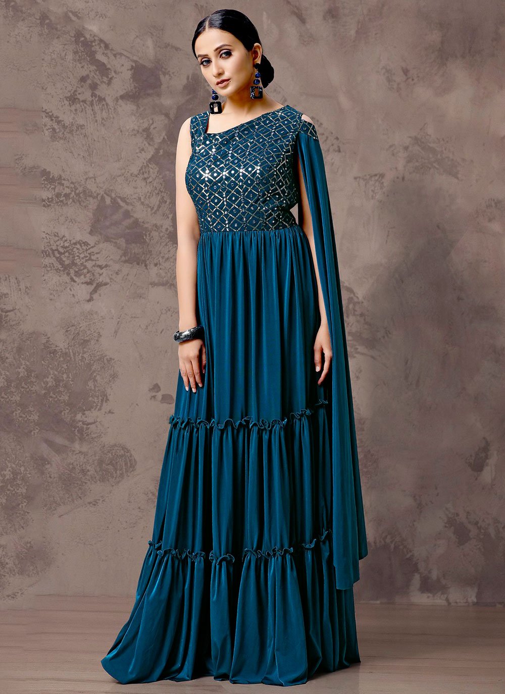 We unfurl our the intricacy and exclusivity of our creations highlighted in such a gorgeous teal imported and lycra designer gown. The sequins work on dress personifies the overall appearance. (Slight variation in color, fabric & work is possible. Model images are only representative.)