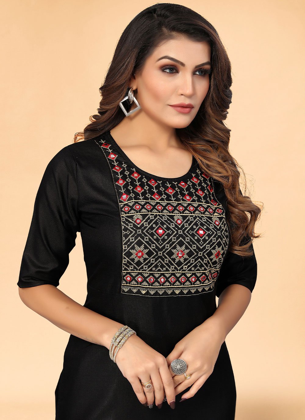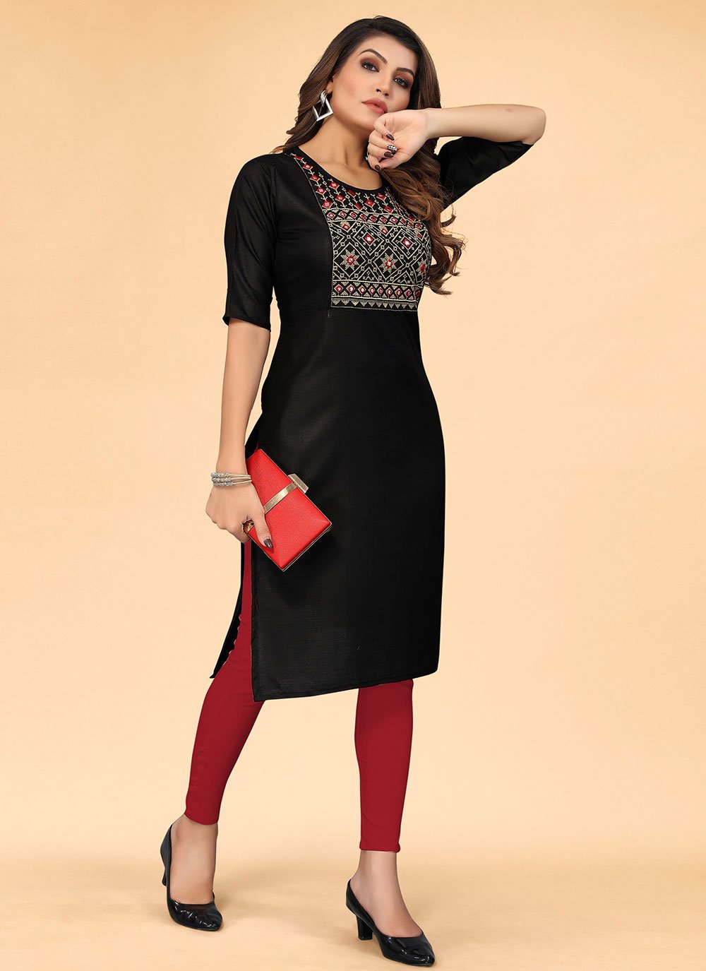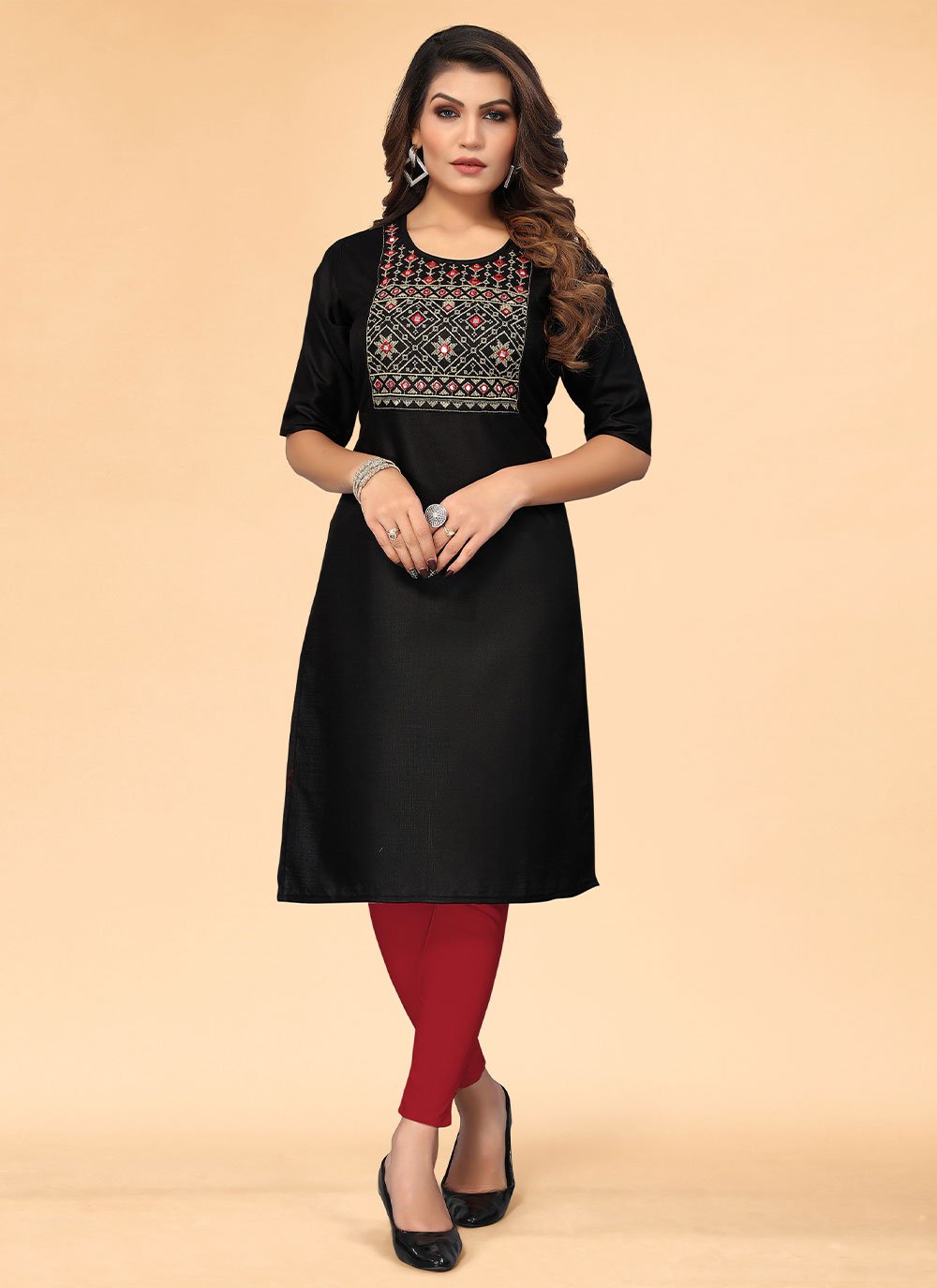We unfurl our the intricacy and exclusivity of our creations highlighted in this black cotton designer kurti. The embroidered work on dress personifies the whole appearance. (Slight variation in color, fabric & work is possible. Model images are only representative.)