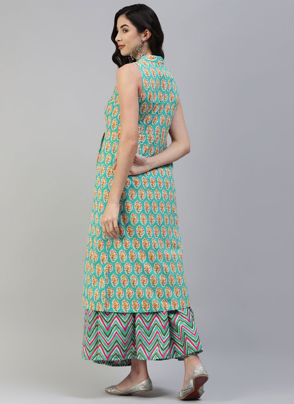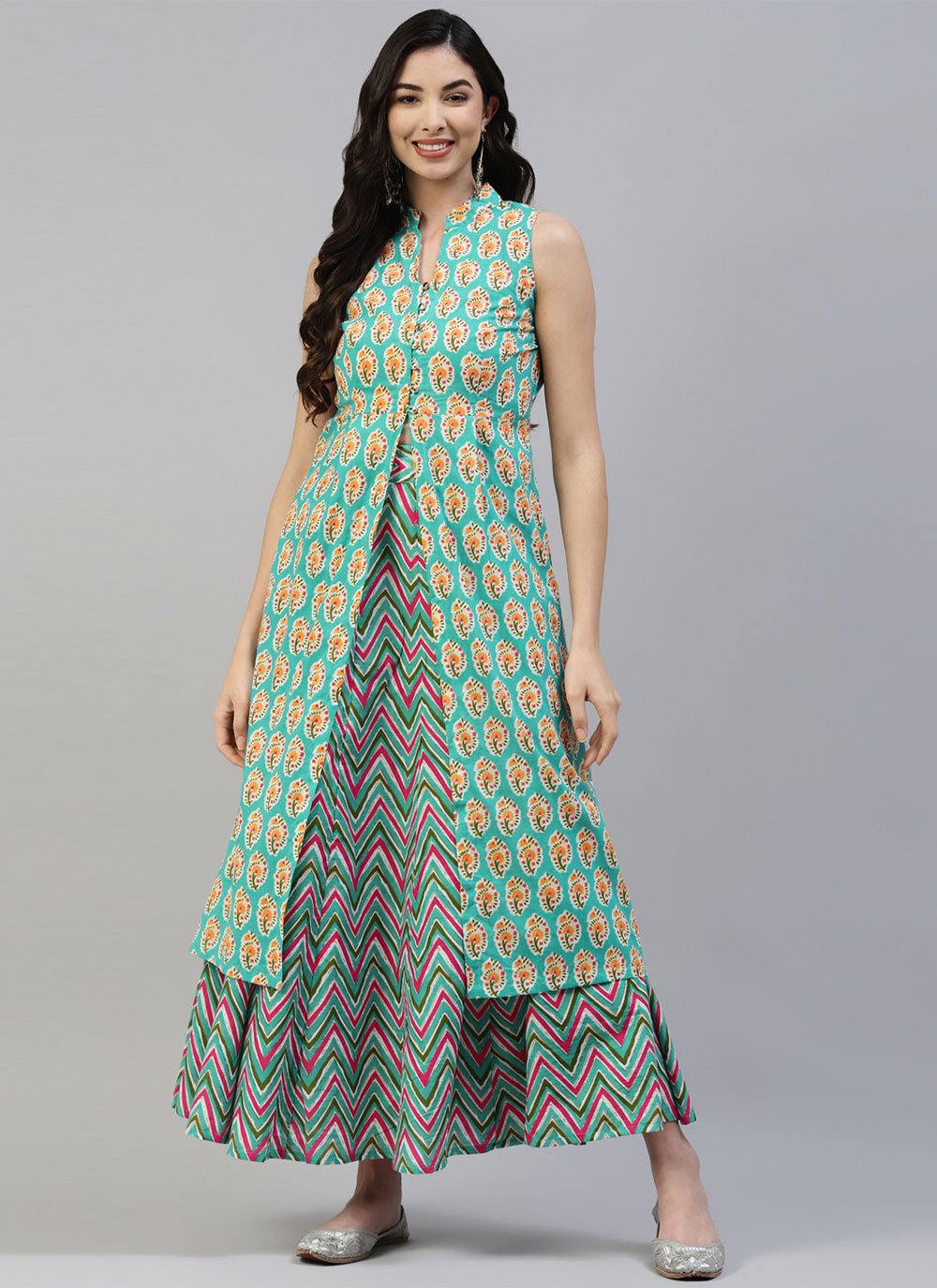 Attract compliments by this green cotton designer kurti. The amazing attire creates a dramatic canvas with fantastic printed work. (Slight variation in color, fabric & work is possible. Model images are only representative.)