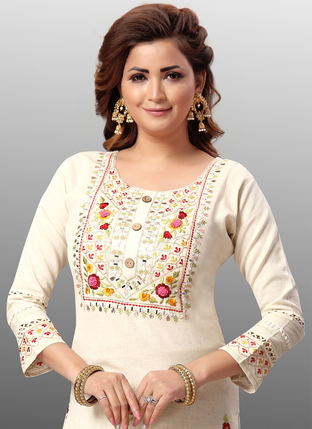 Appear stunningly beautiful with this off white cotton designer kurti. The embroidered work appears to be like chic and excellent for festival and party. (Slight variation in color, fabric & work is possible. Model images are only representative.)