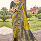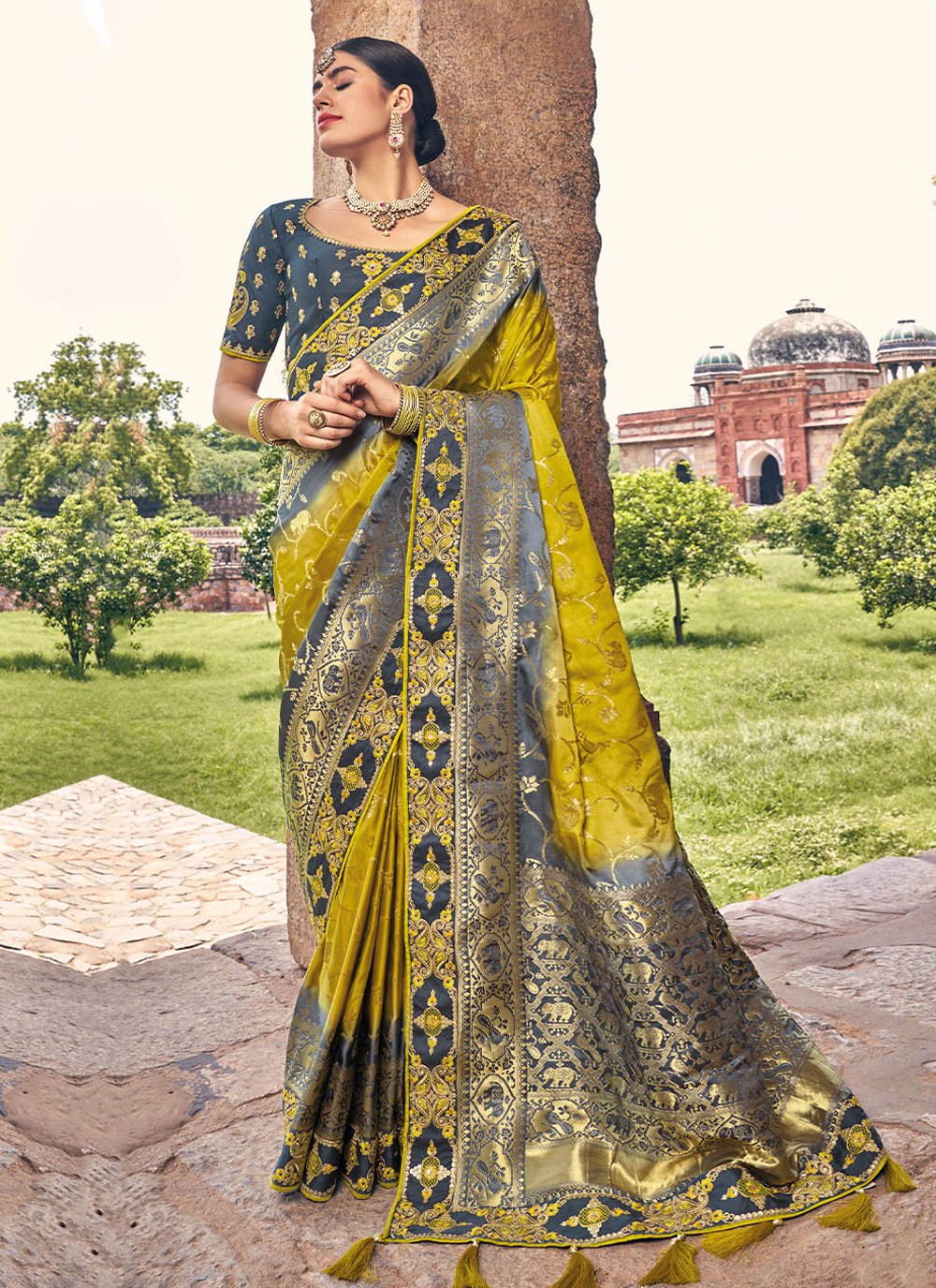 Precise splendor comes out as a result of the dressing style and design with this green silk designer saree. This pretty attire is displaying some unbelievable embroidery done with weaving work. Comes with matching blouse. (Slight variation in color, fabric & work is possible. Model images are only representative.)