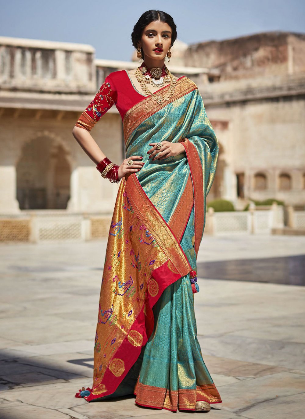 Authentic elegance comes out as a results of the dressing style with this green silk designer saree. The ethnic weaving work with the attire adds a sign of splendor statement for the look. Comes with matching blouse. (Slight variation in color, fabric & work is possible. Model images are only representative.)