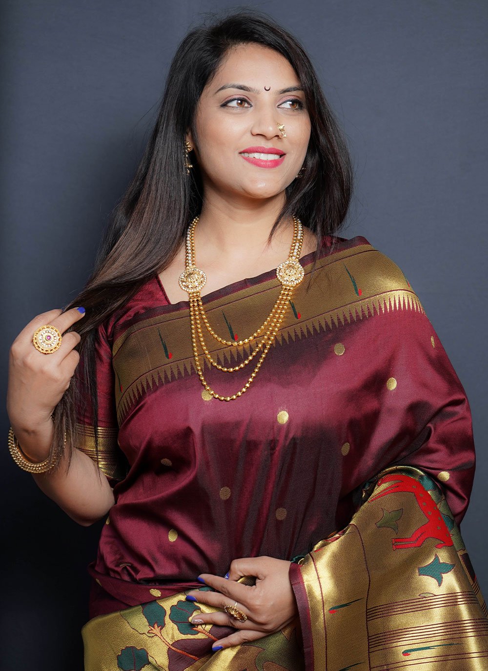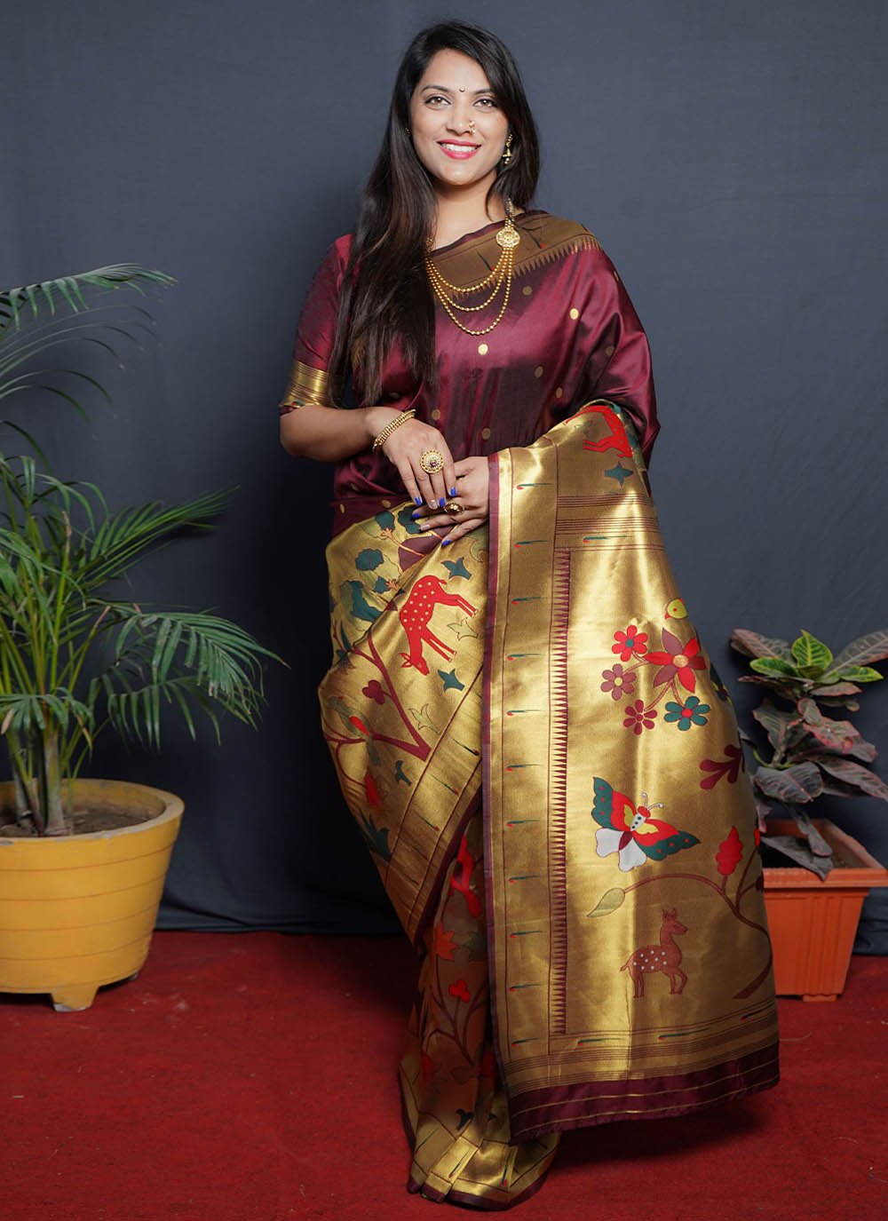 Its a master piece in its class glorifying your timeless beauty. Pamper the women in you with this beautiful maroon silk designer saree. The jacquard work work personifies the entire appearance. Comes with matching blouse. (Slight variation in color, fabric & work is possible. Model images are only representative.)
