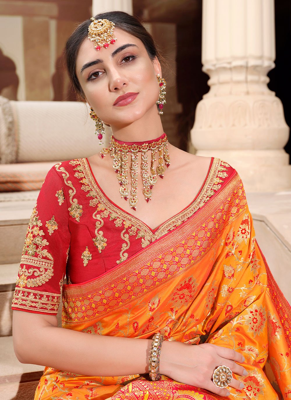 Add grace and charm towards the look in this desirable orange silk designer saree. This attractive attire is displaying some brilliant embroidery done with weaving work. Comes with matching blouse. (Slight variation in color, fabric & work is possible. Model images are only representative.)