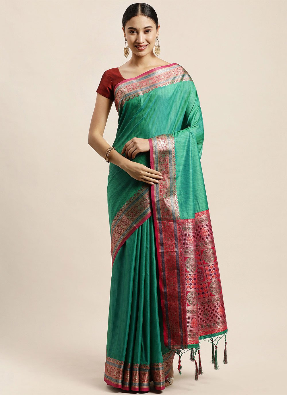 Get going with this majestic and wonderful piece and make your dream attire look richer to your persona. Be ready to slip in the comfort zone of sea green silk designer saree. Look ravishing clad in this attire which is enhanced weaving work. Comes with matching blouse. (Slight variation in color, fabric & work is possible. Model images are only representative.)