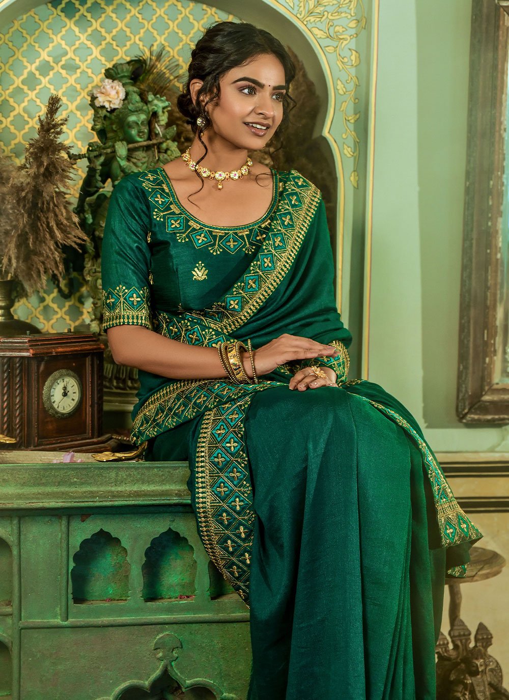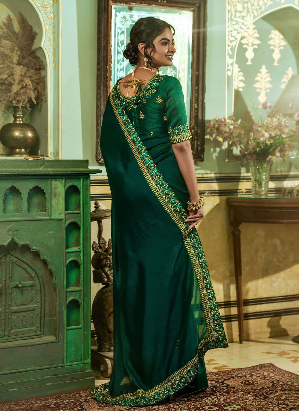 Its a master piece in its class glorifying your timeless beauty. Pamper the women in you with this beautiful green vichitra silk designer saree. The embroidered and lace work personifies the entire appearance. Comes with matching blouse. (Slight variation in color, fabric & work is possible. Model images are only representative.)