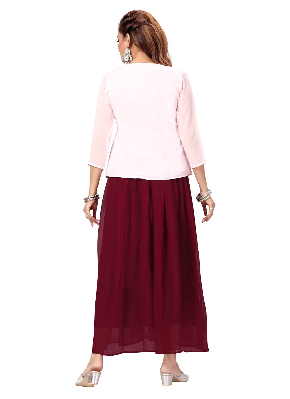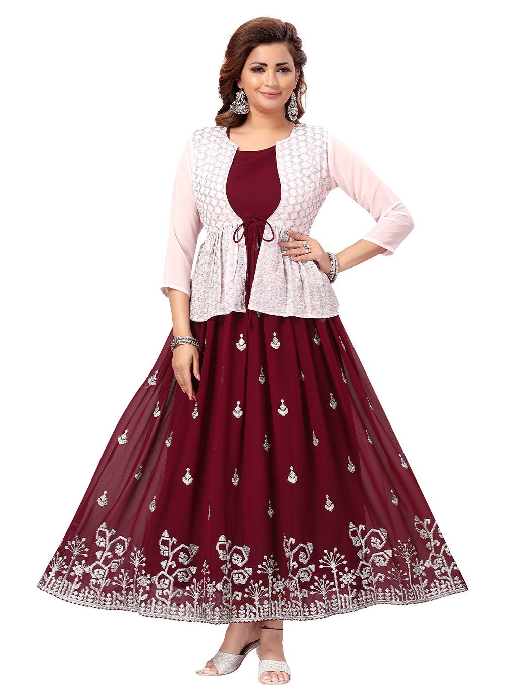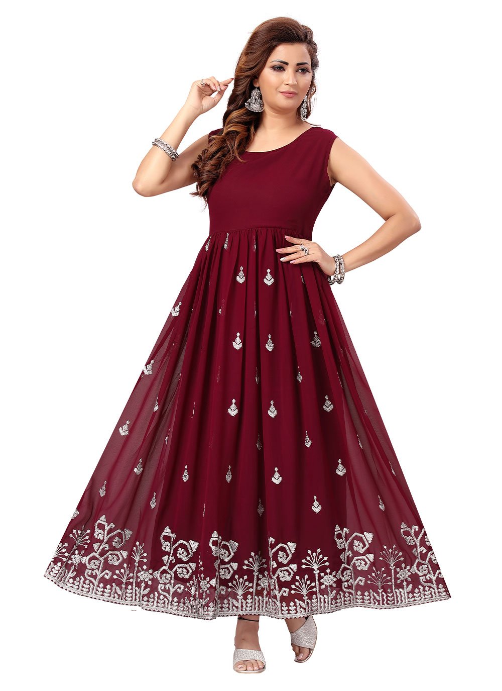 Make the heads flip whenever you costume up with this dazzling maroon georgette readymade gown. The interesting stone work in the course of the dress is awe inspiring. (Slight variation in color, fabric & work is possible. Model images are only representative.)