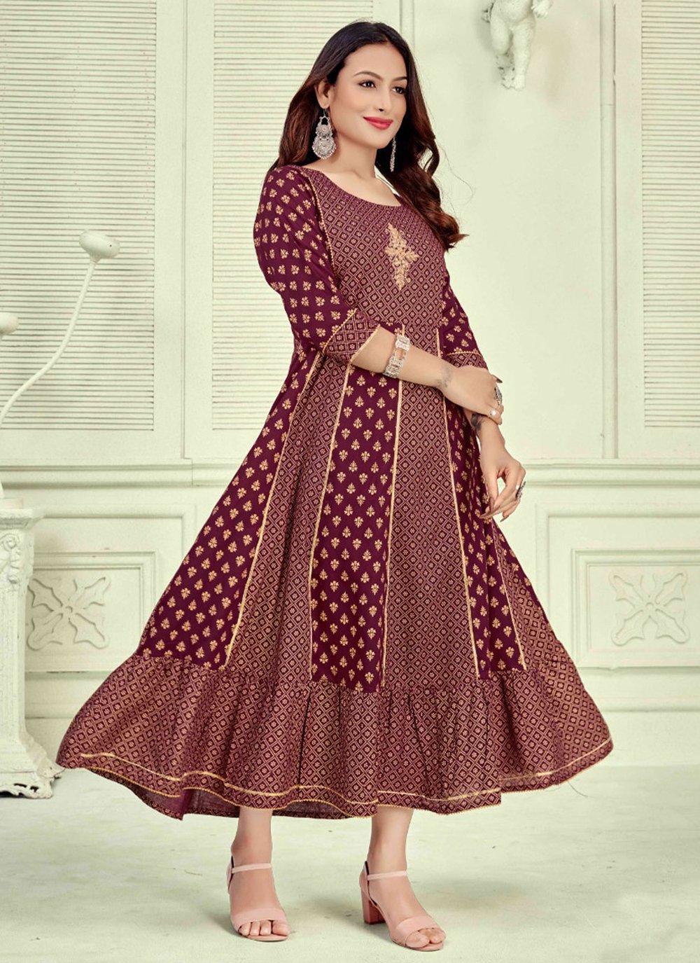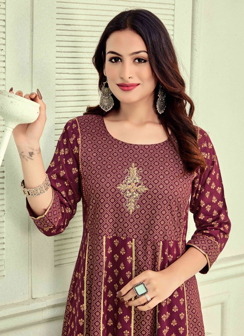 Vogue and pattern will be on the peak of your magnificence as soon as you attire this purple rayon gown . Beautified with foil print work all synchronized nicely with the design and style of the attire. (Slight variation in color, fabric & work is possible. Model images are only representative.)