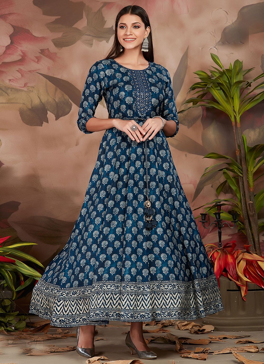 Design and trend would be at the peak of your beauty when you dresses this blue silk gown . The appealing digital print work a vital attribute of this dress. (Slight variation in color, fabric & work is possible. Model images are only representative.)