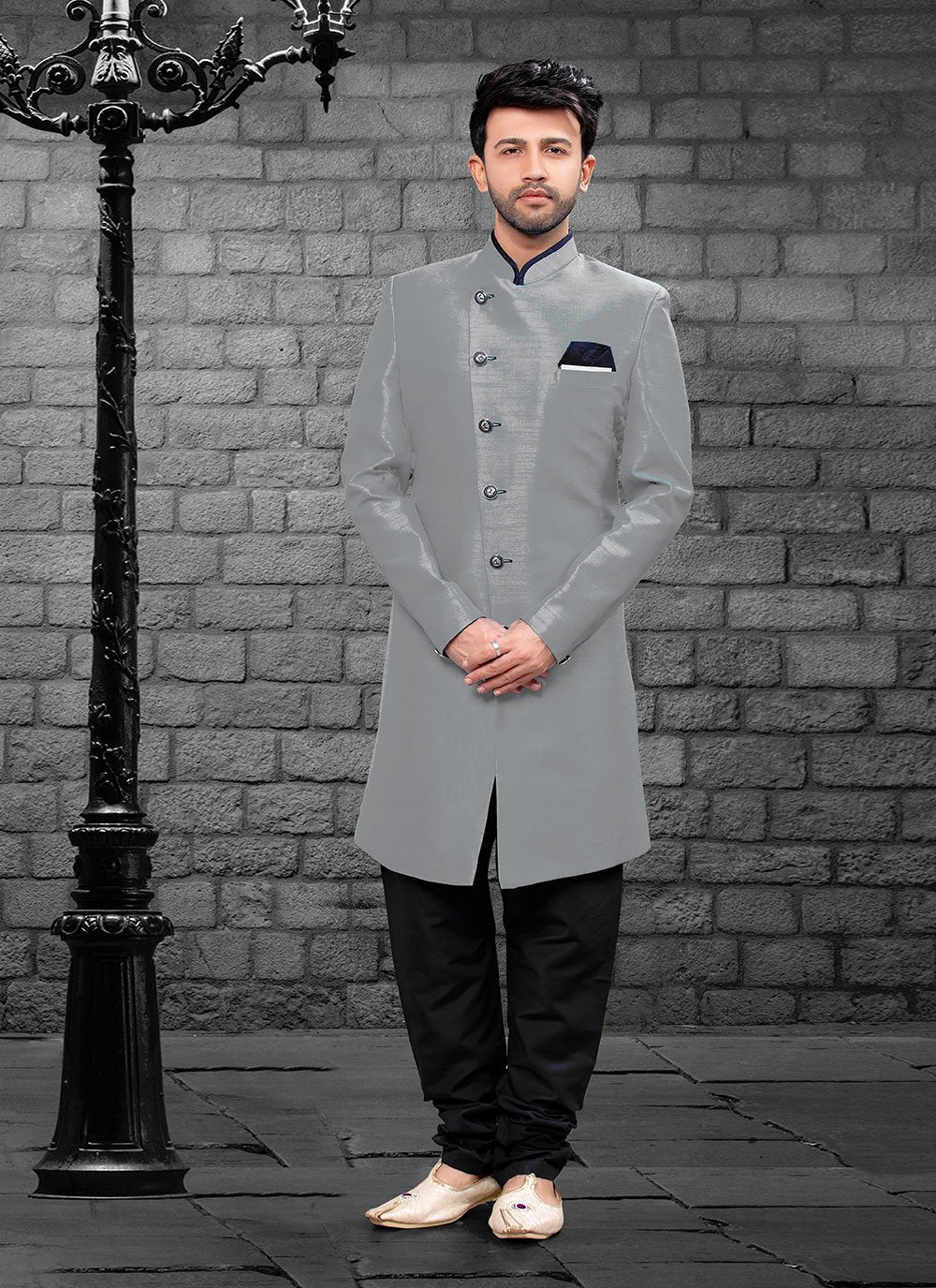 Indo Western Art Dupion Silk Grey Buttons Mens