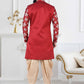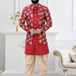 Red jacquard and silk indo western with decorative patterns along with embroidered work on it .