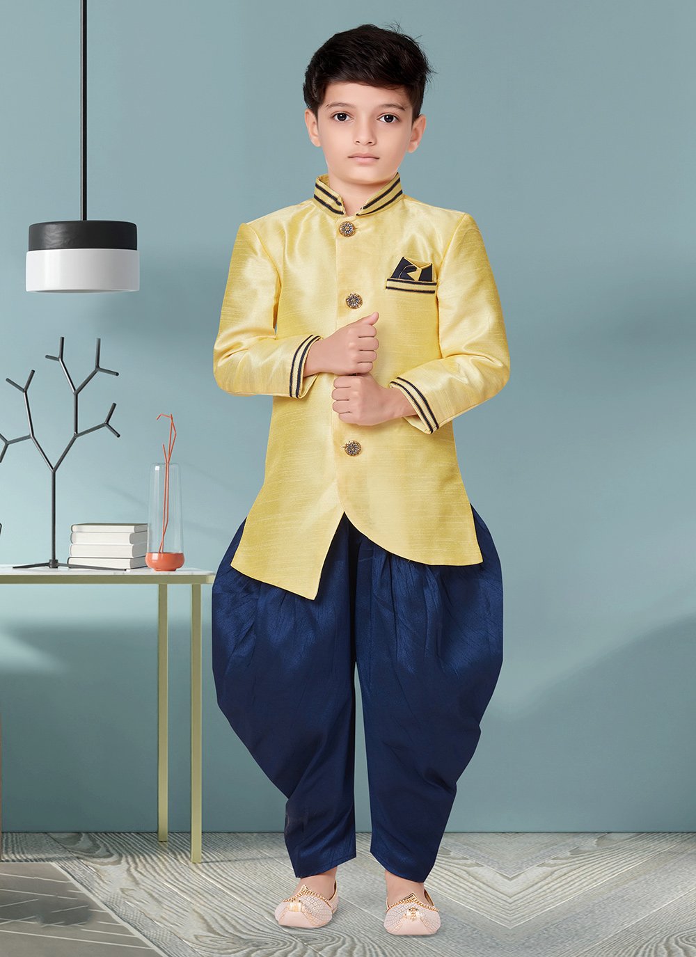 Indo Western Sherwani Banarasi Silk Yellow Thread Kids