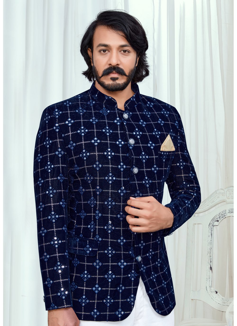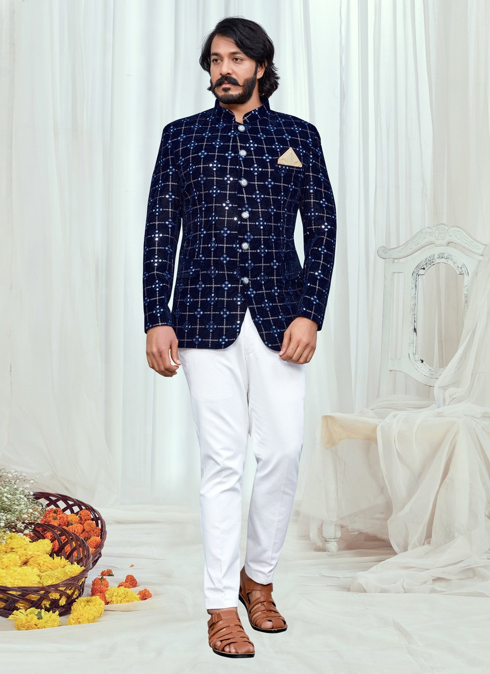 Attractive navy blue velvet jodhpuri suit having embroidered and mirror work is sure to make you look your best. Make your day most attractive and attractive with this ensemble.
