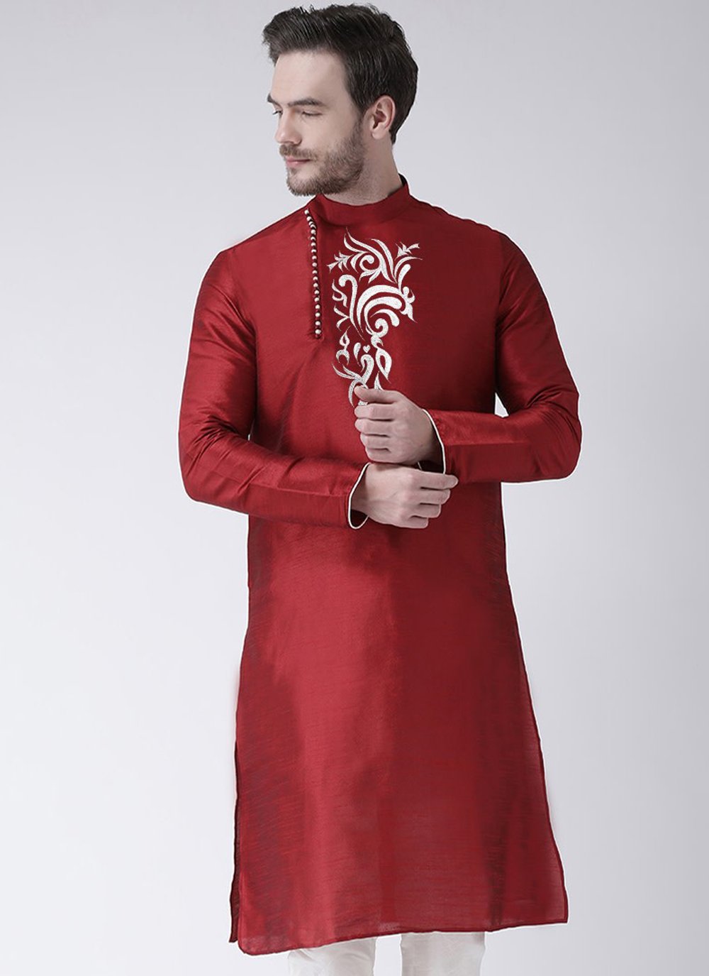 Kurta Art Dupion Silk Maroon Embroidered Mens