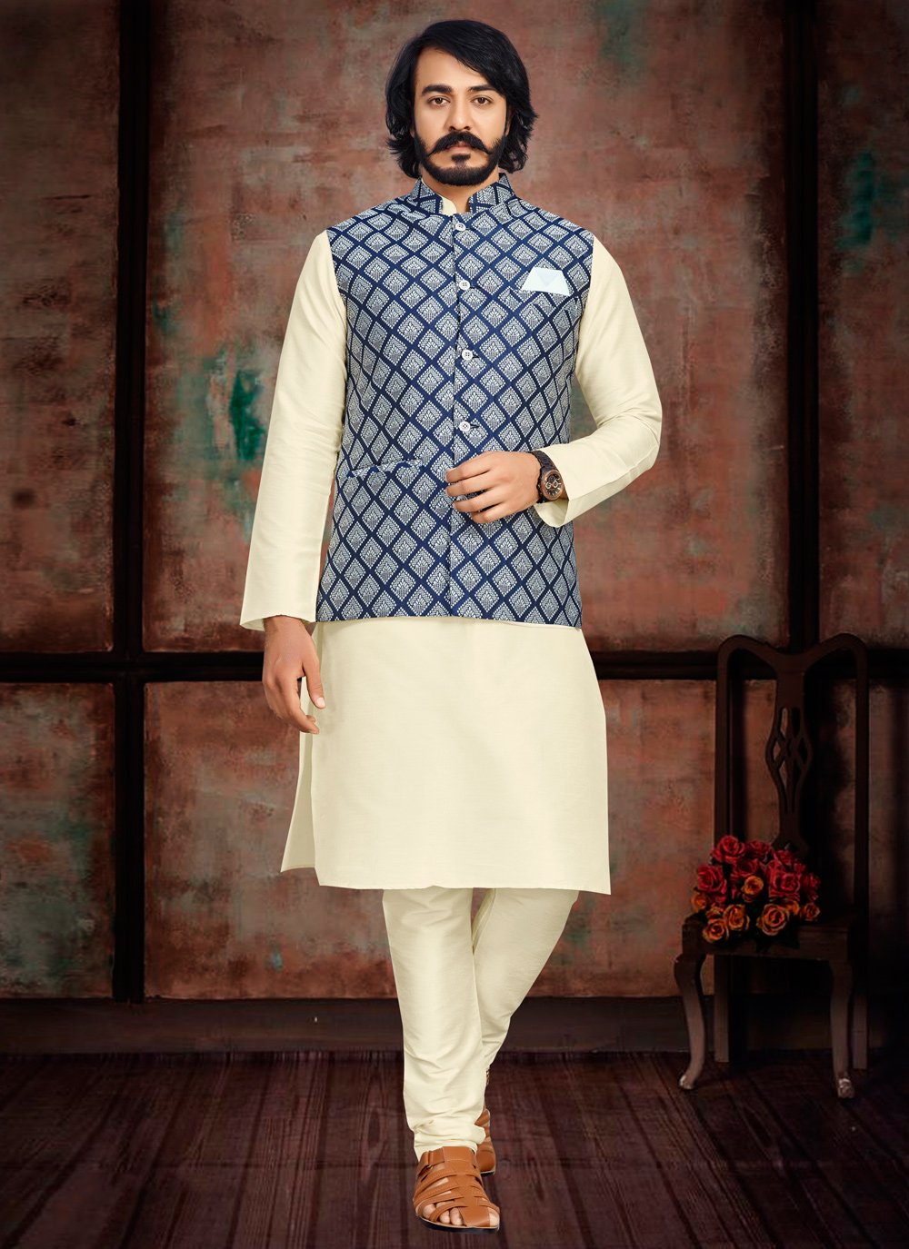 Kurta Payjama With Jacket Art Silk Jacquard Blue Cream Fancy Work Mens