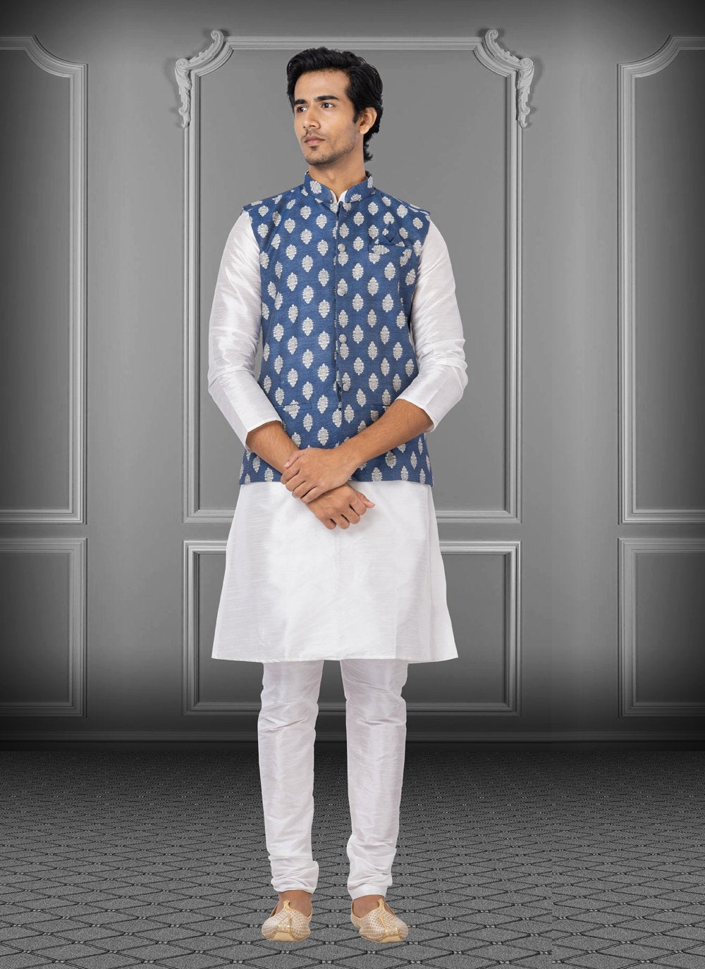 Kurta Payjama With Jacket Dupion Silk Jacquard Silk Blue Off White Fancy Work Mens