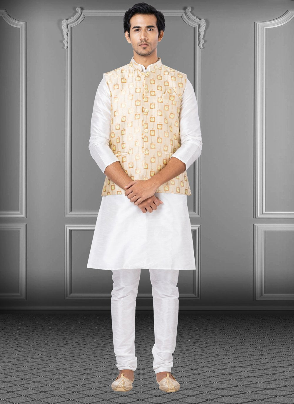 Off white and peach dupion silk and jacquard silk kurta payjama with jacket with enhanced fancy along with matching patterns.