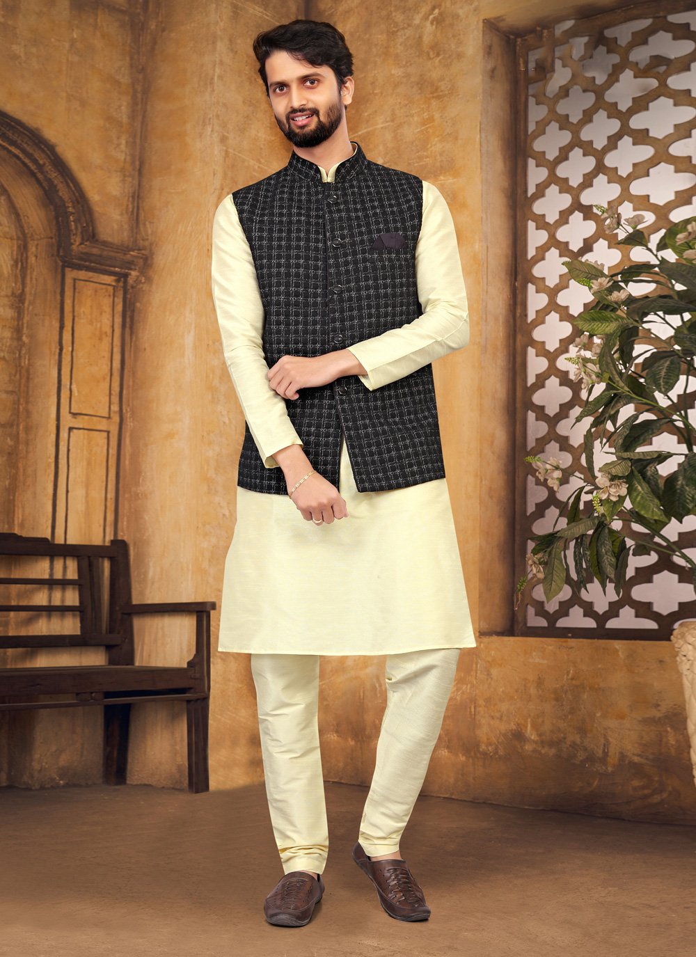 Kurta Payjama With Jacket Silk Black Cream Fancy Work Mens