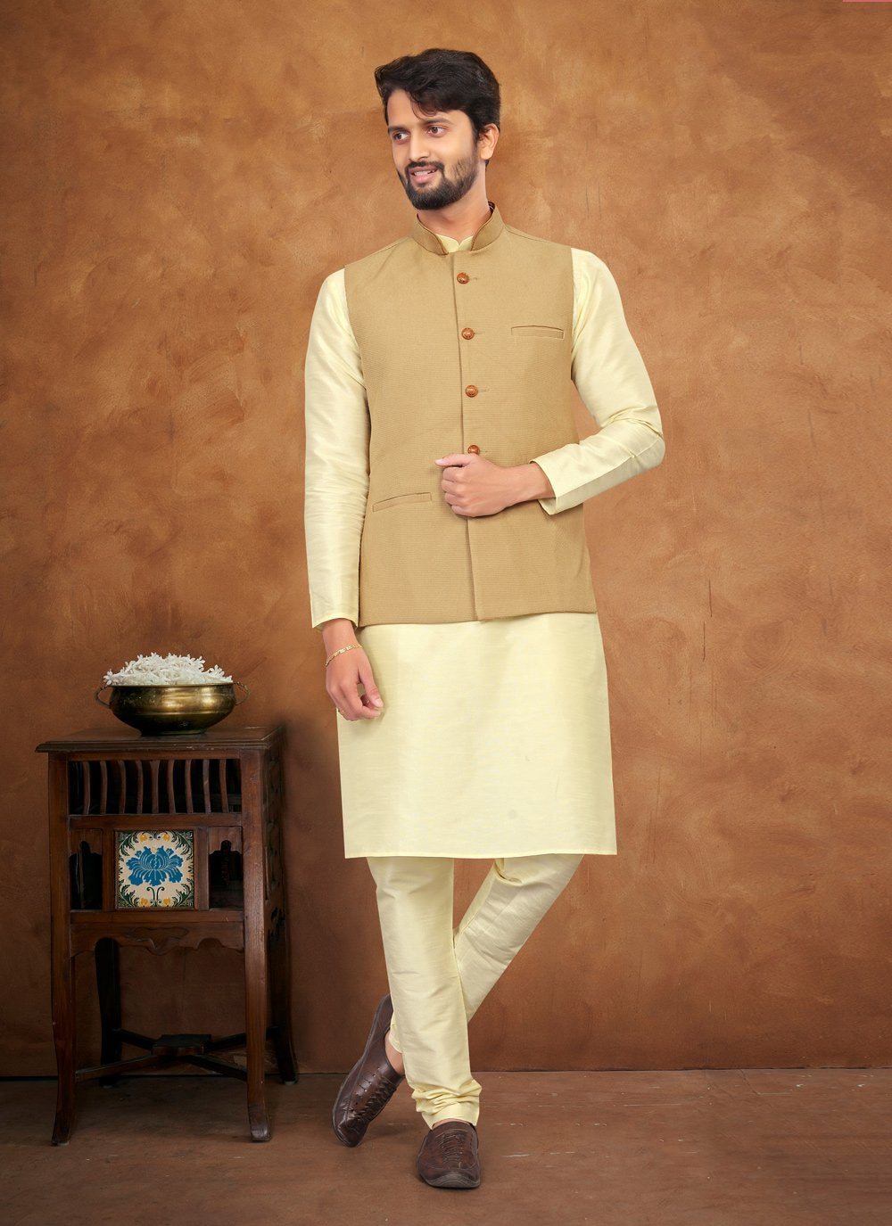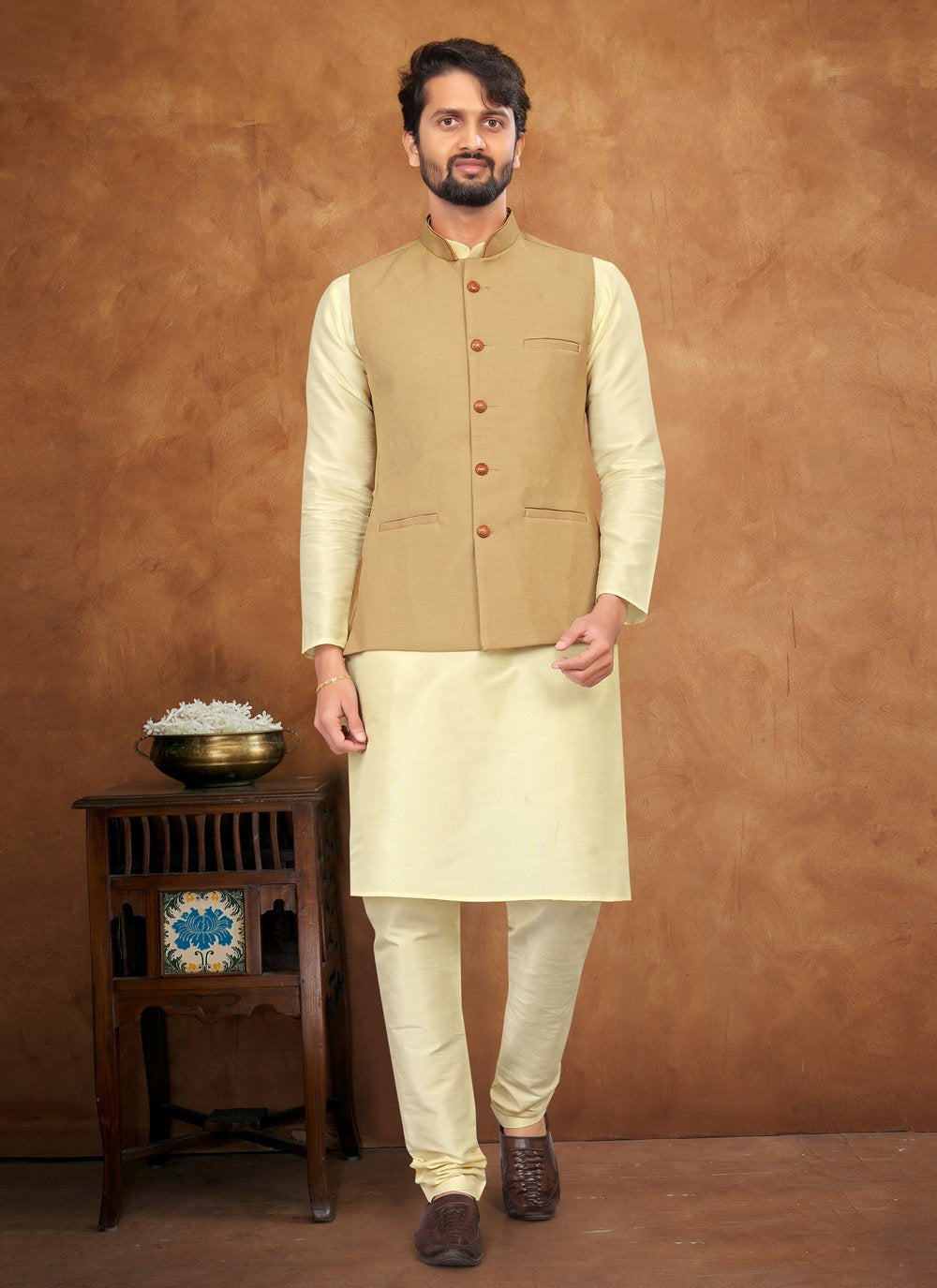 Kurta Payjama With Jacket Silk Cream Khaki Fancy Work Mens