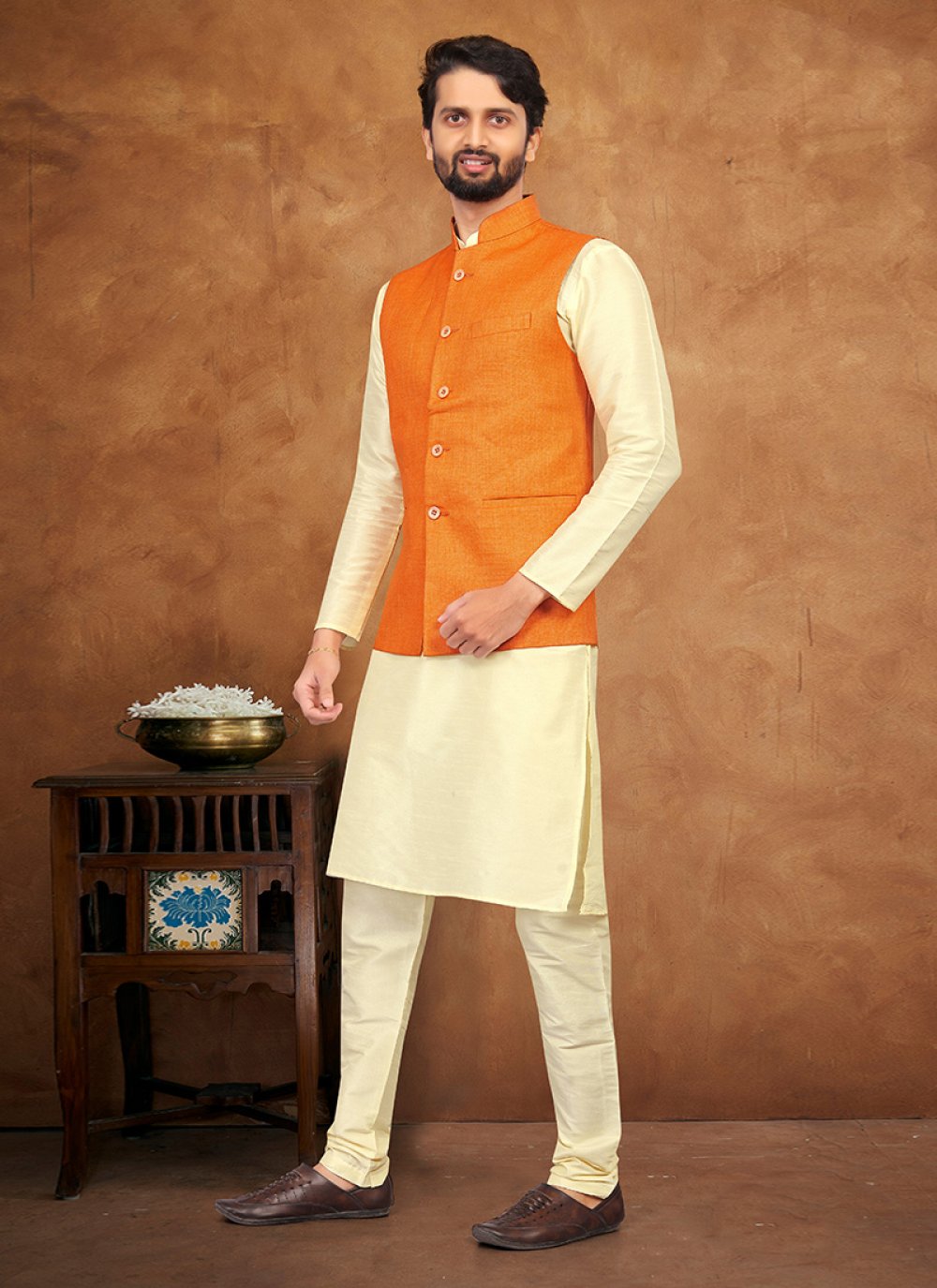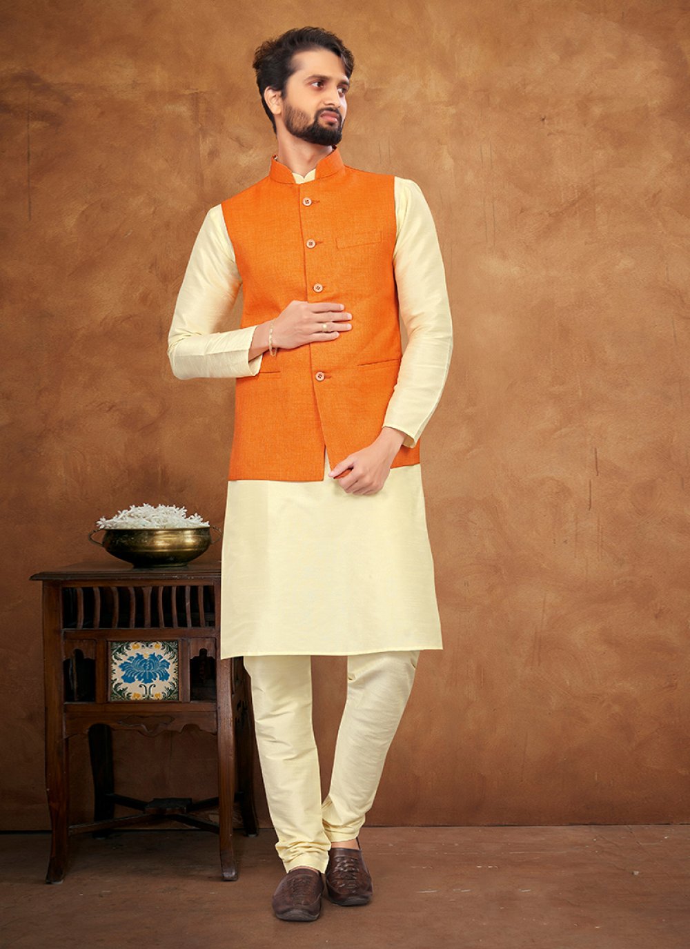 Kurta Payjama With Jacket Silk Cream Orange Fancy Work Mens