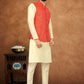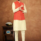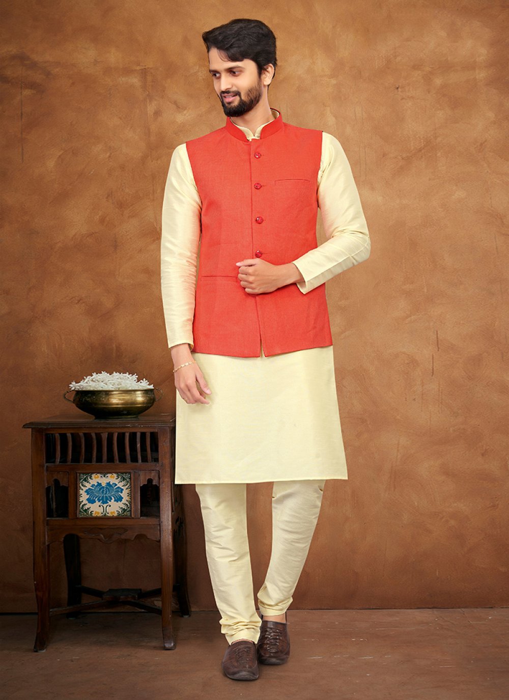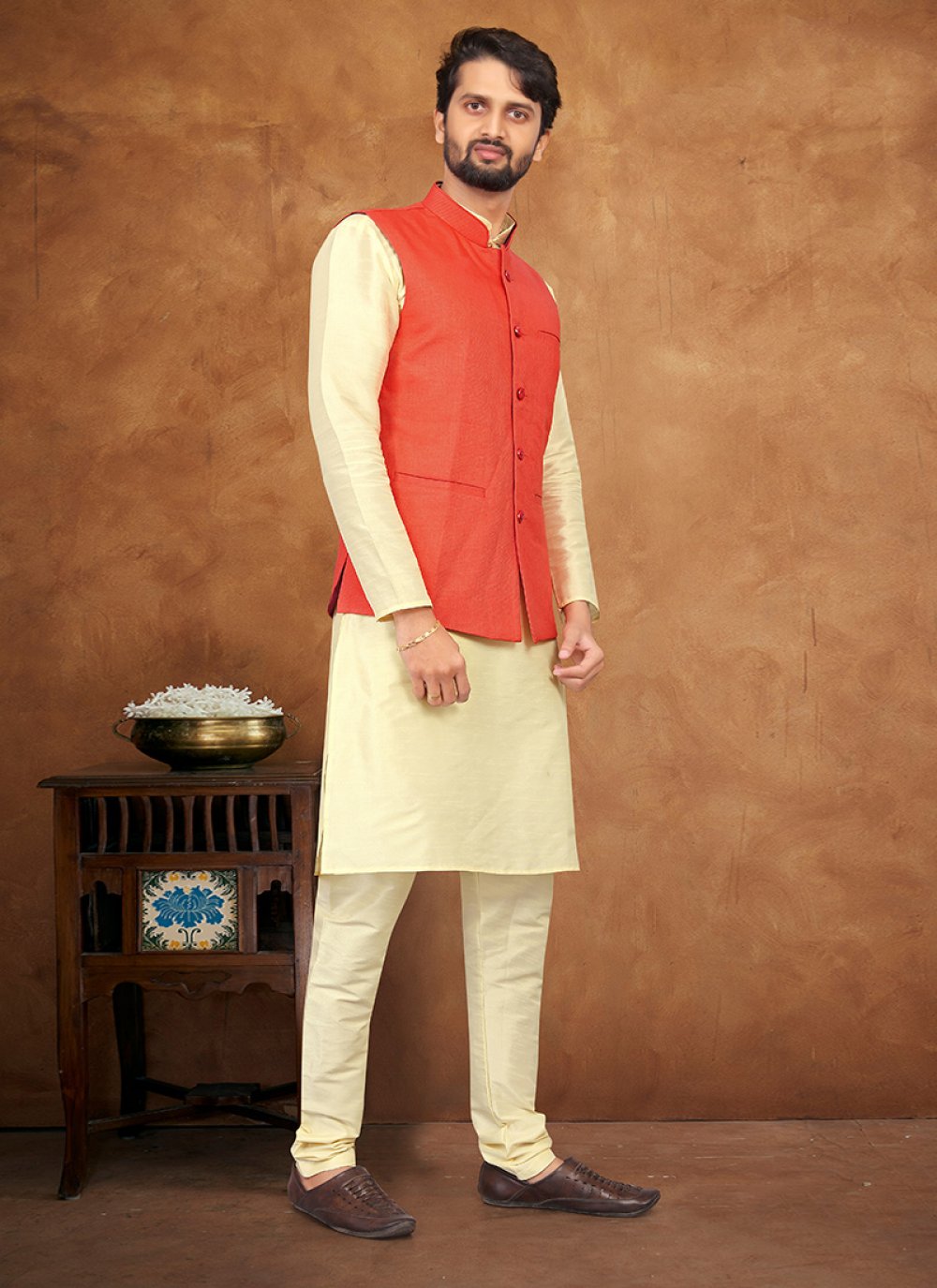 Kurta Payjama With Jacket Silk Cream Red Fancy Work Mens