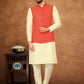 Add style to your ethnic look in this cream and red silk kurta payjama with jacket embellished with fancy.