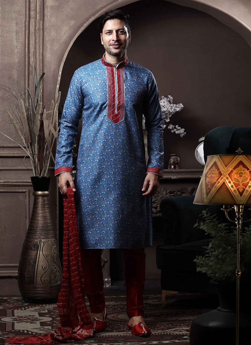 Kurta Pyjama Cotton Blue Print Mens