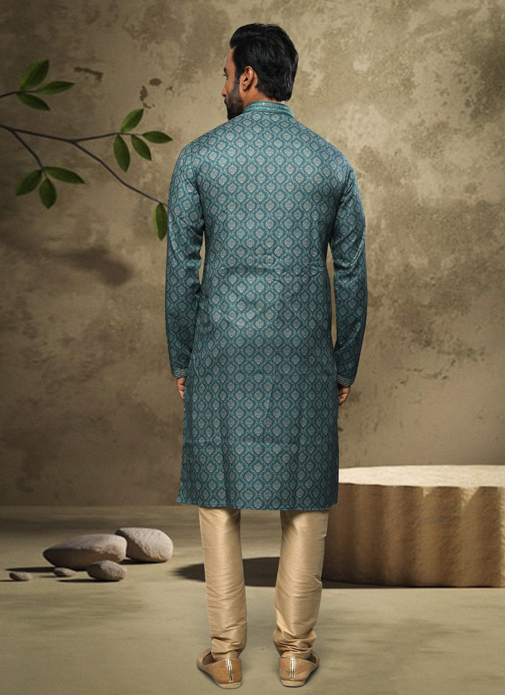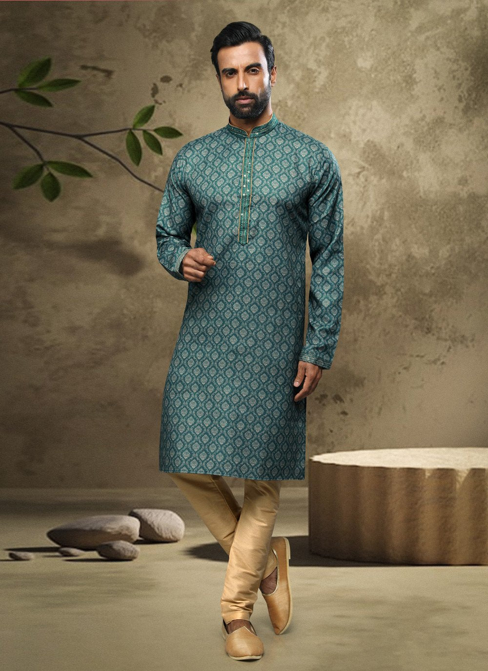 Kurta Pyjama Handloom Cotton Green Digital Print Mens