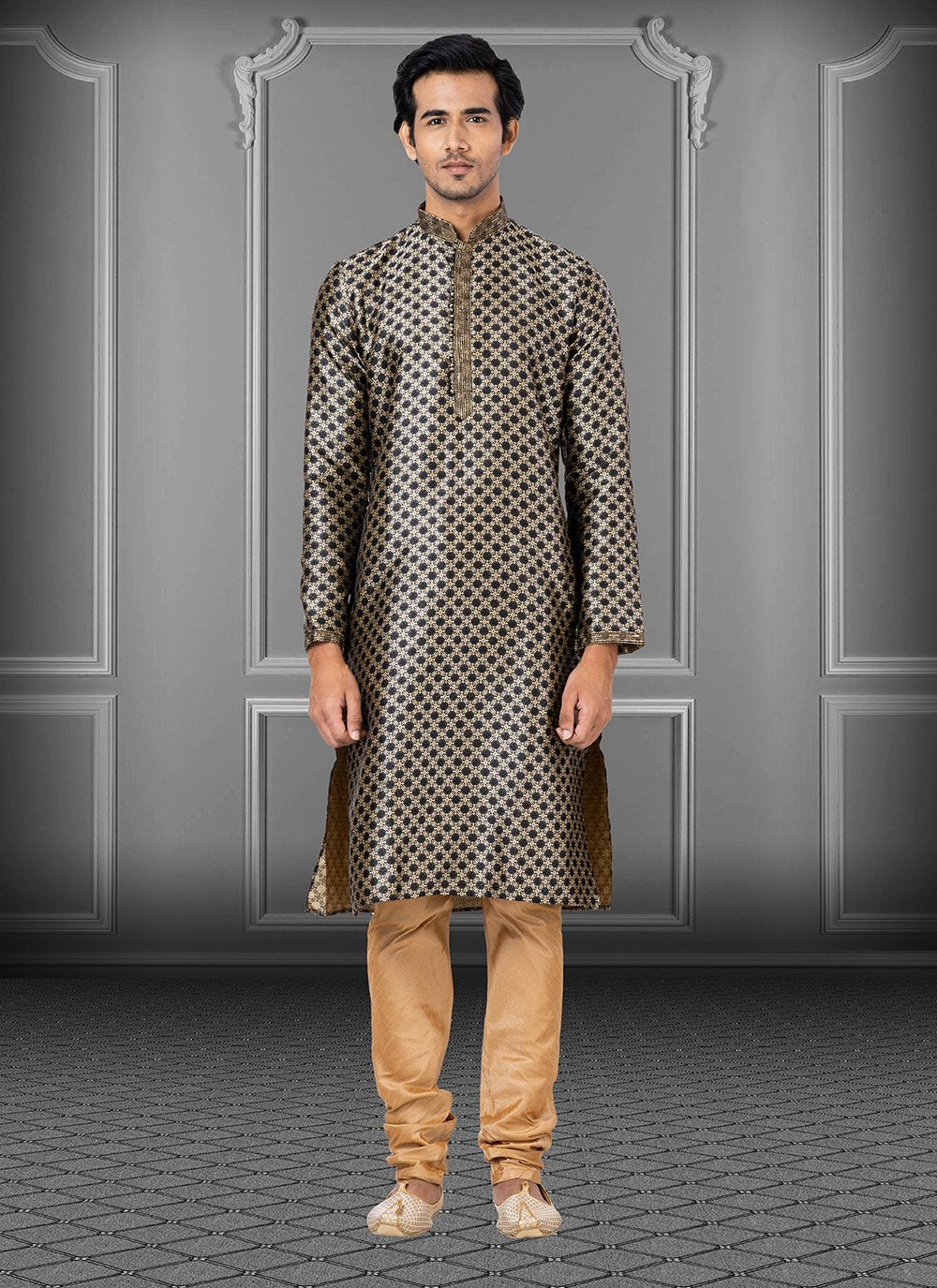 Black jacquard kurta pyjama is stylized with tone on tone designs. Printed embellishments add to the look.