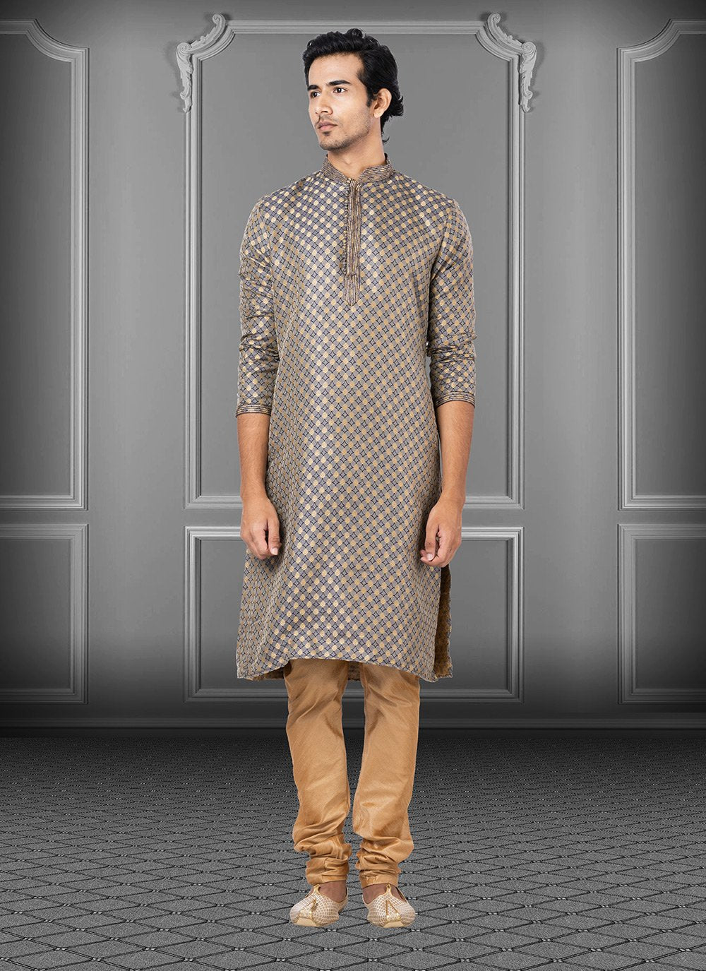This enticing grey shade jacquard kurta pyjama is stylized with tone on tone designs. Fancy embellishments add to the look.